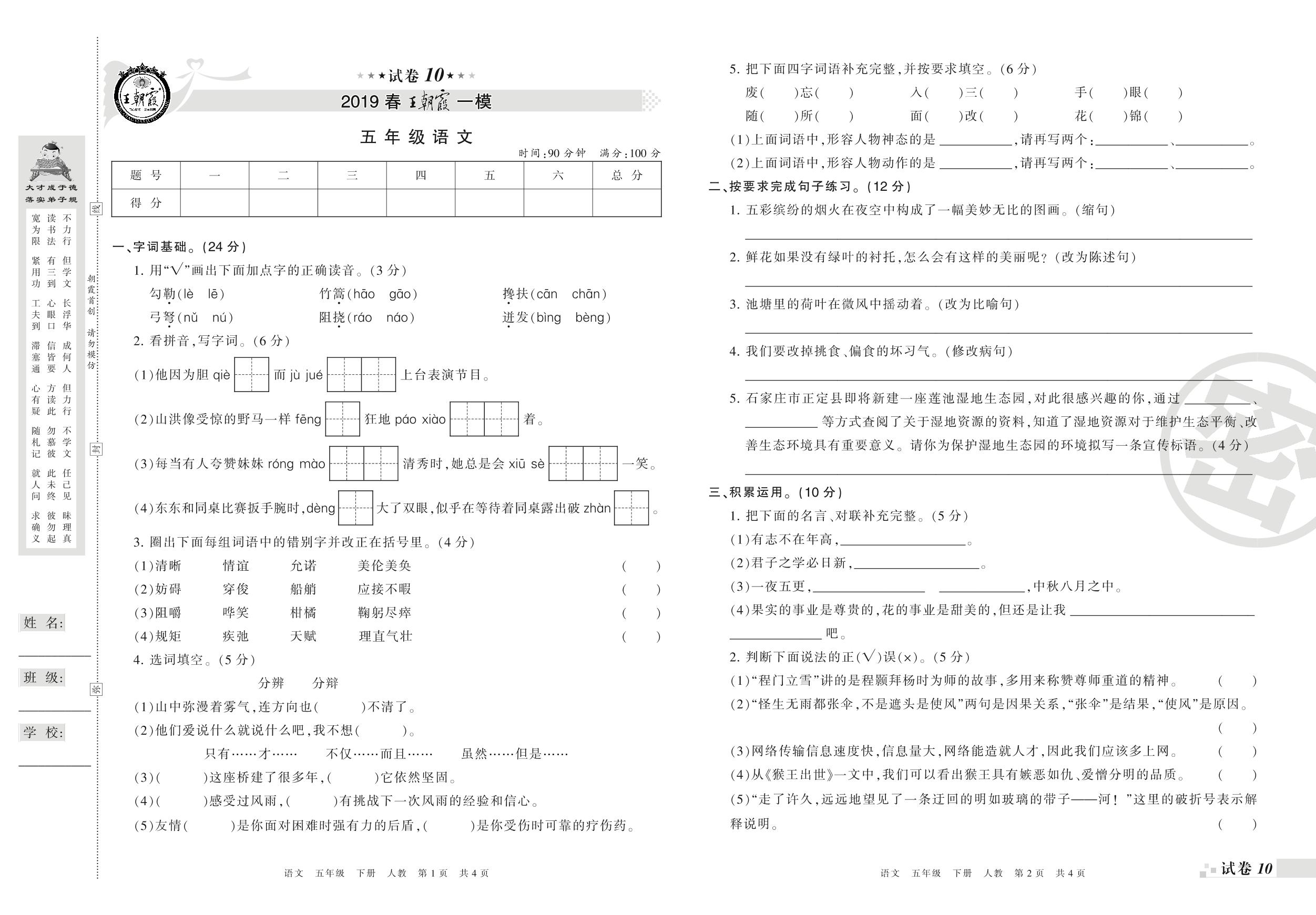 王朝霞期末模拟卷五年级下册语文(人教版)_R210801200406【10】