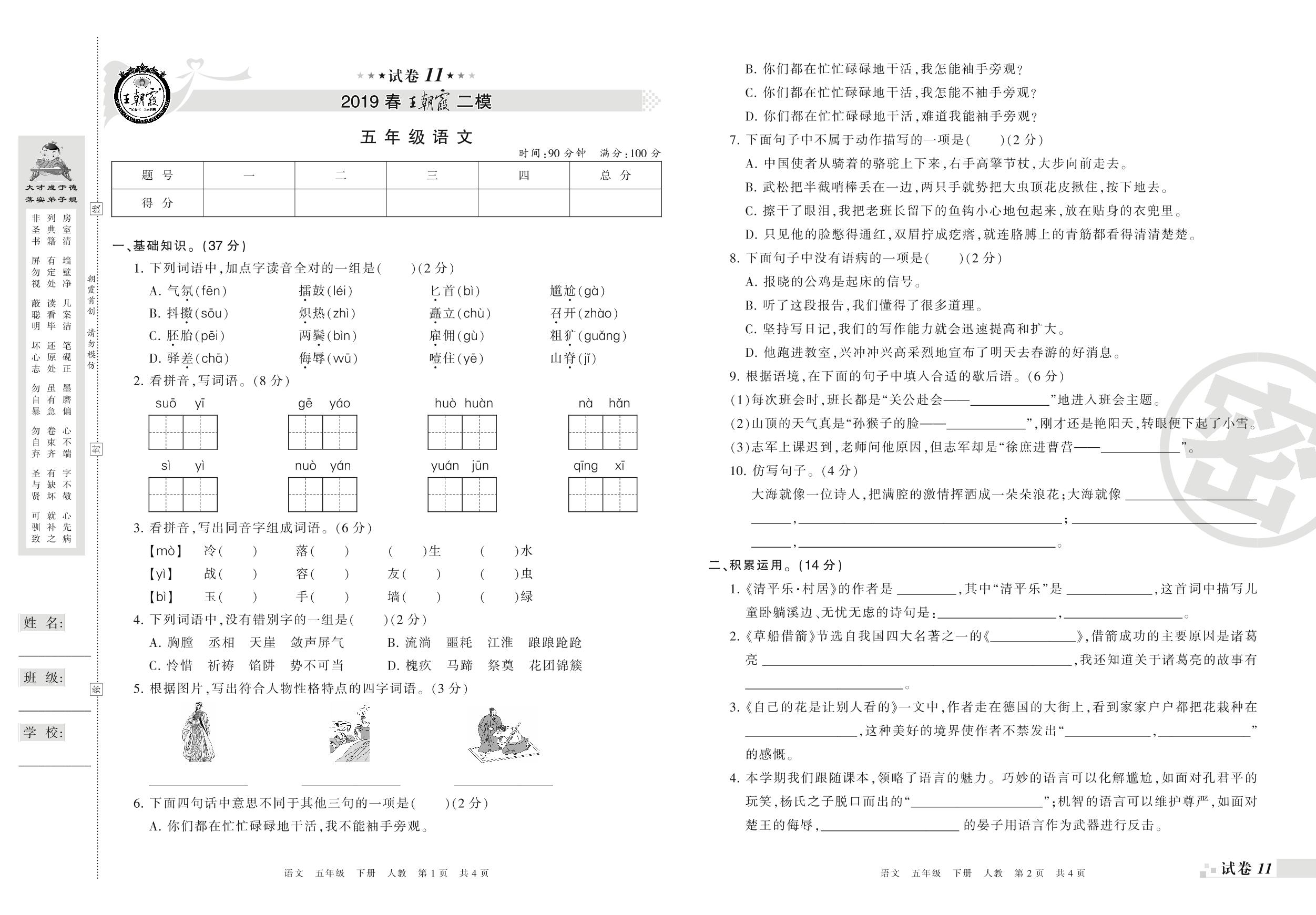王朝霞期末模拟卷五年级下册语文(人教版)_R210801200411【11】
