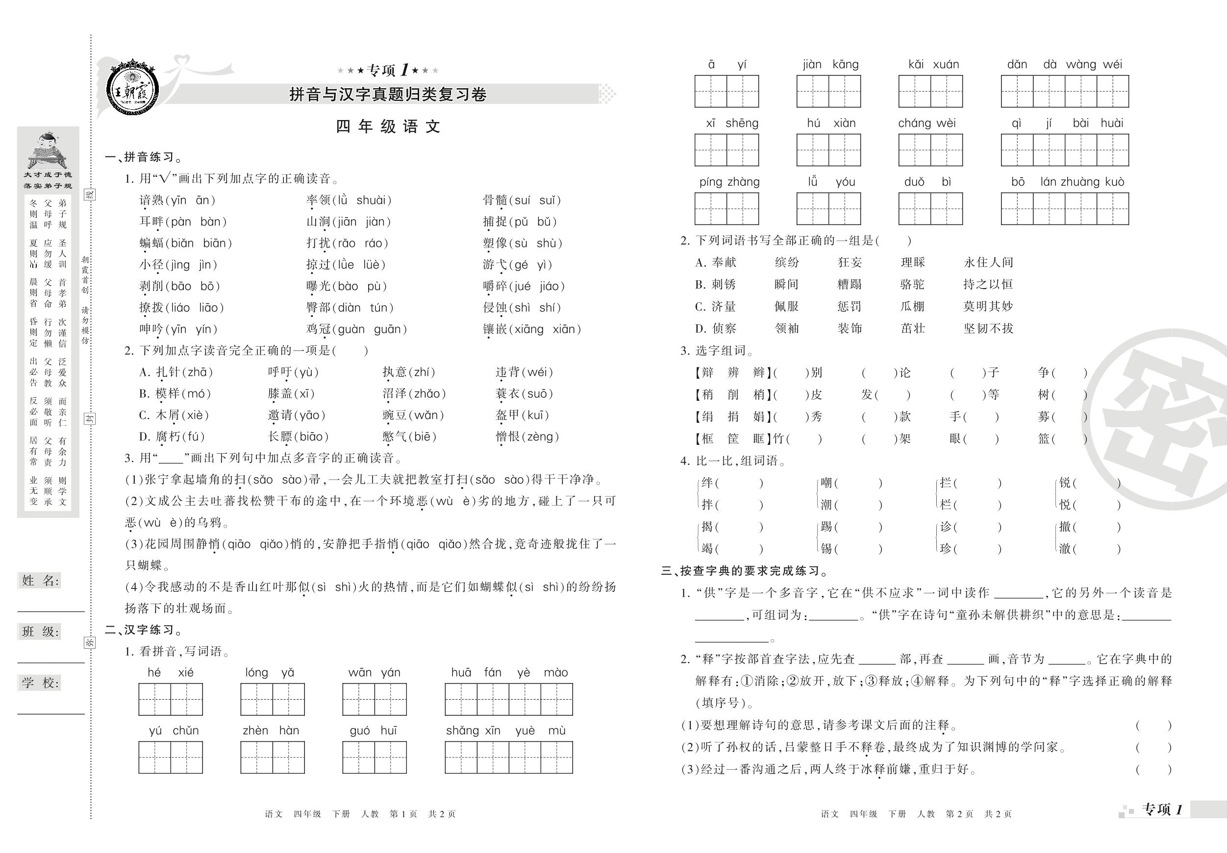 王朝霞期末专项卷——拼音与汉字、词语真题归类复习四年级下册语文(人教版)_R210801200415【0】