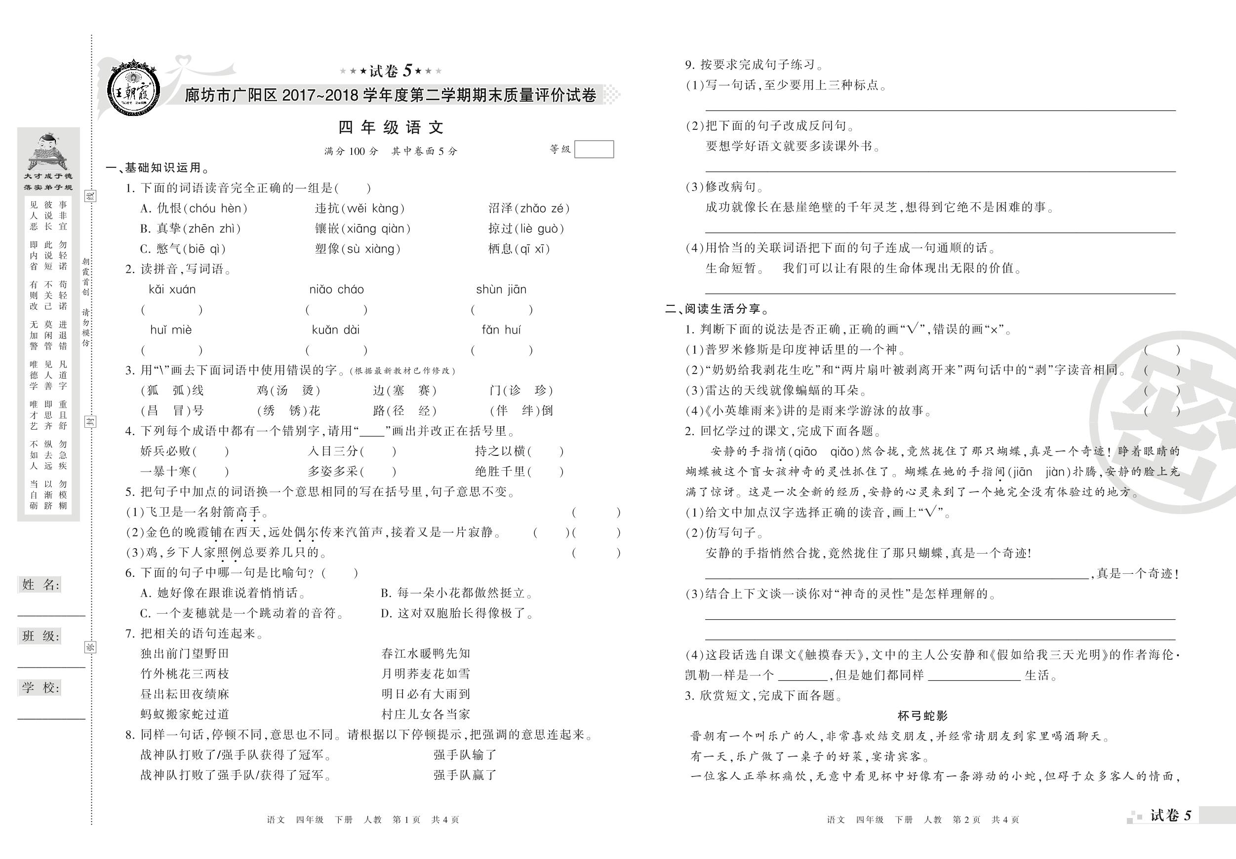 2017-2018学年第二学期廊坊市广阳区四年级语文试卷(人教版)【5】