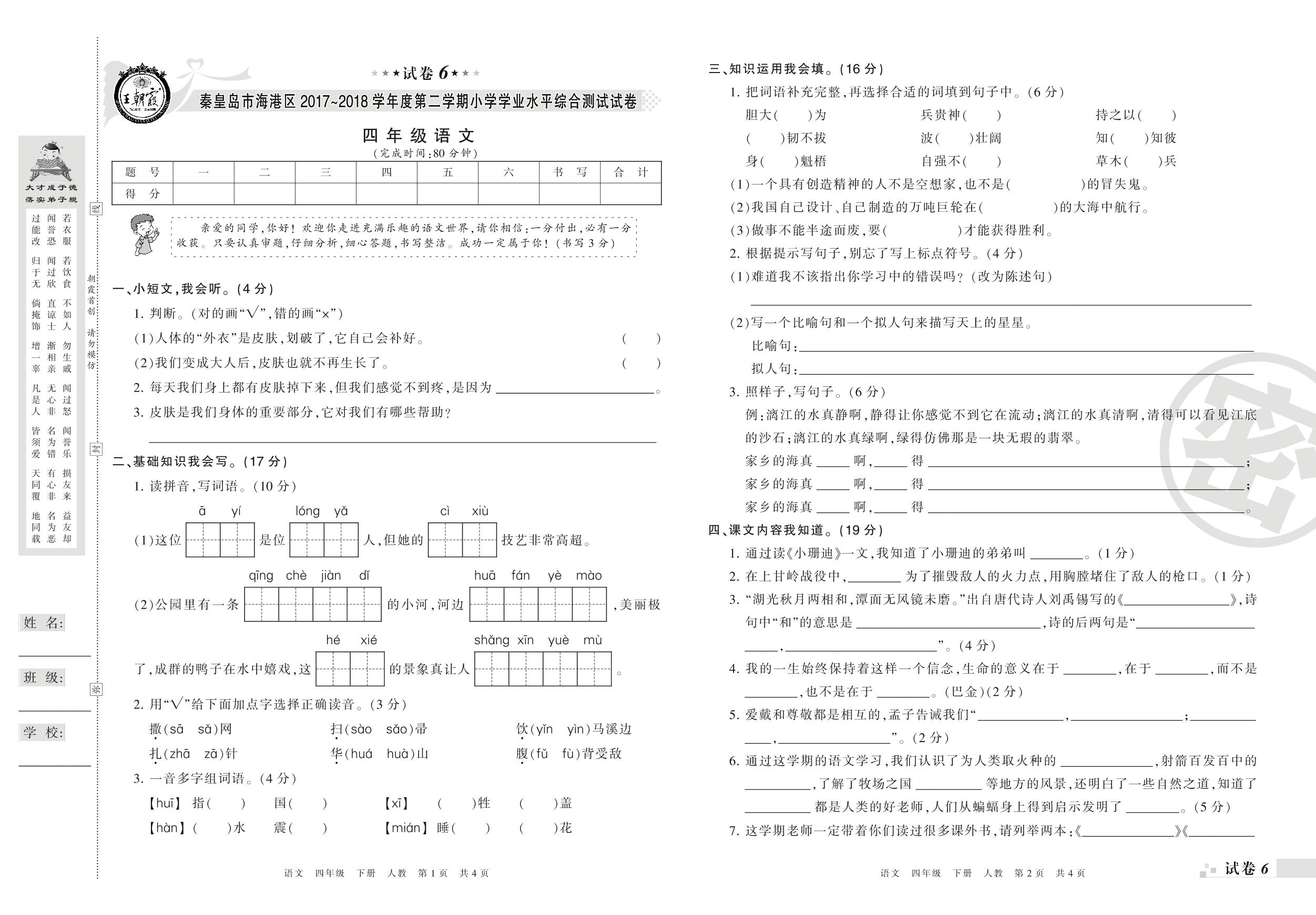 2017-2018学年第二学期秦皇岛市海港区四年级语文试卷(人教版)【6】