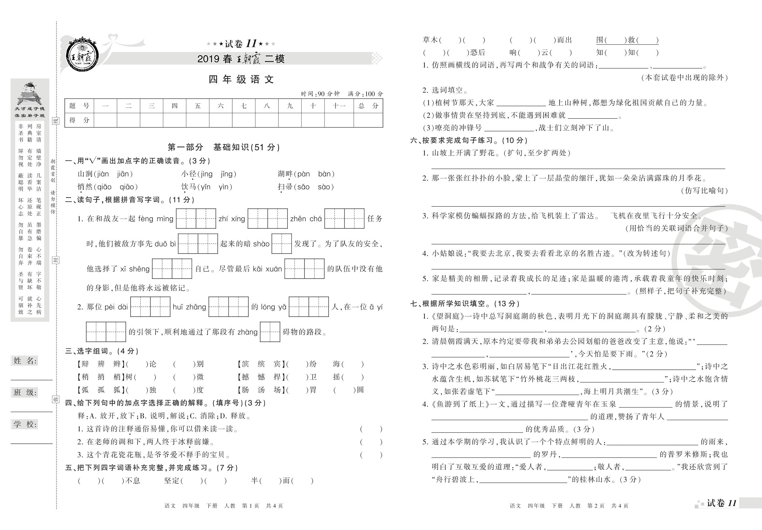 王朝霞期末模拟卷四年级下册语文(人教版)_R210801200506【11】