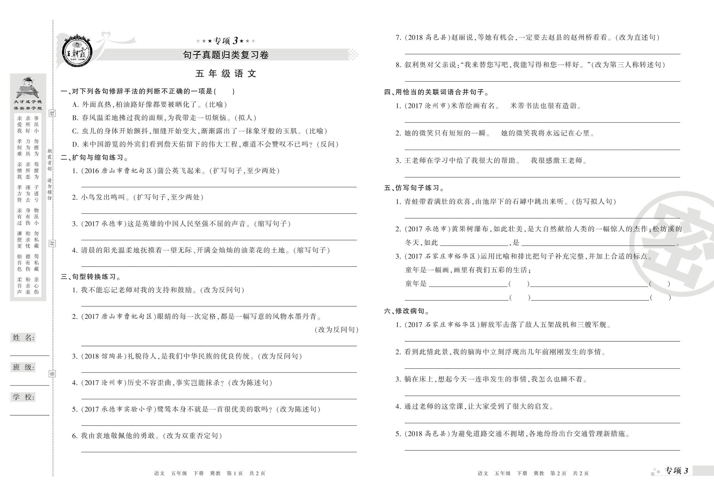 王朝霞期末专项卷——句子、课文内容真题归类复习五年级下册语文(冀教版)_R210801200513【0】