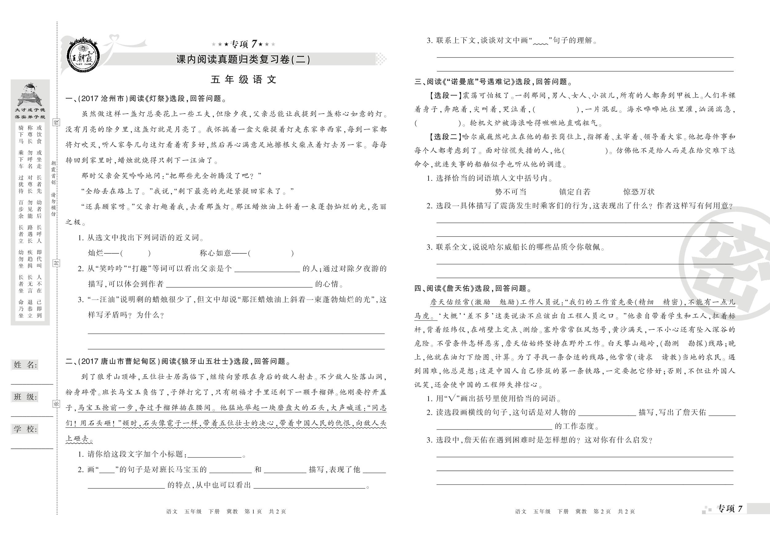 王朝霞期末专项卷——课内阅读、课外阅读与写作真题归类复习五年级下册语文(冀教版)【0】