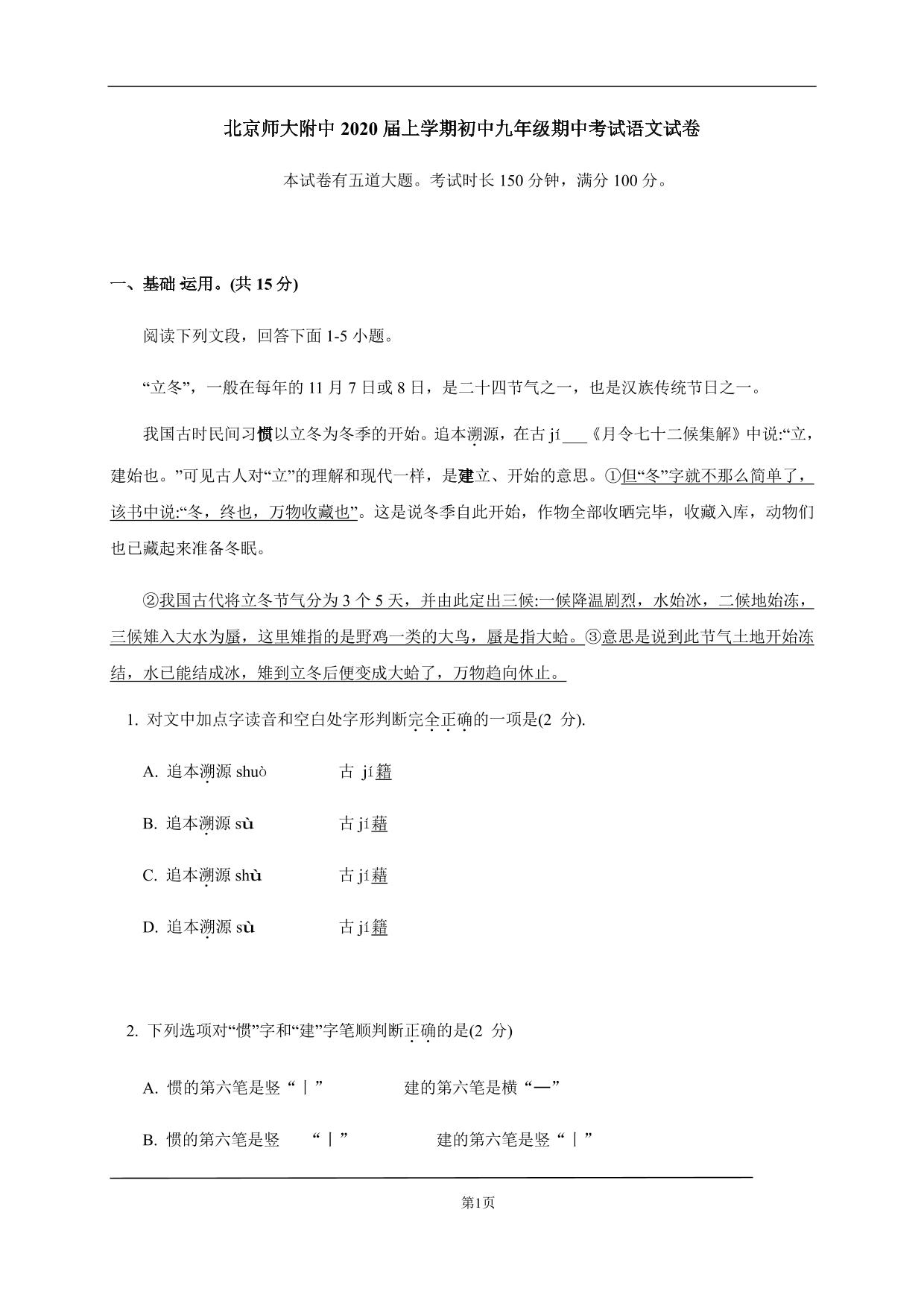 北京师范大学附属中学2020届上学期初中九年级期中考试语文试卷人教版