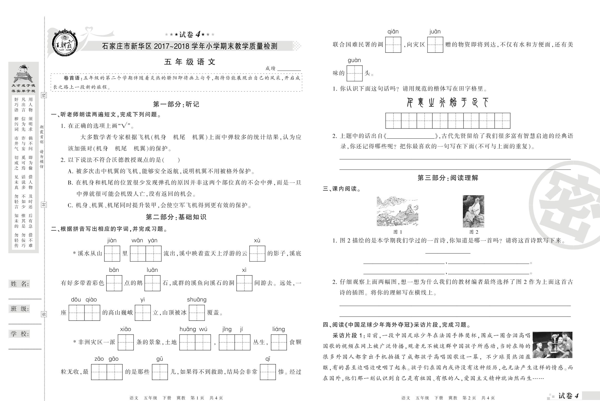 2017-2018学年第二学期石家庄市新华区五年级语文试卷(冀教版)【4】