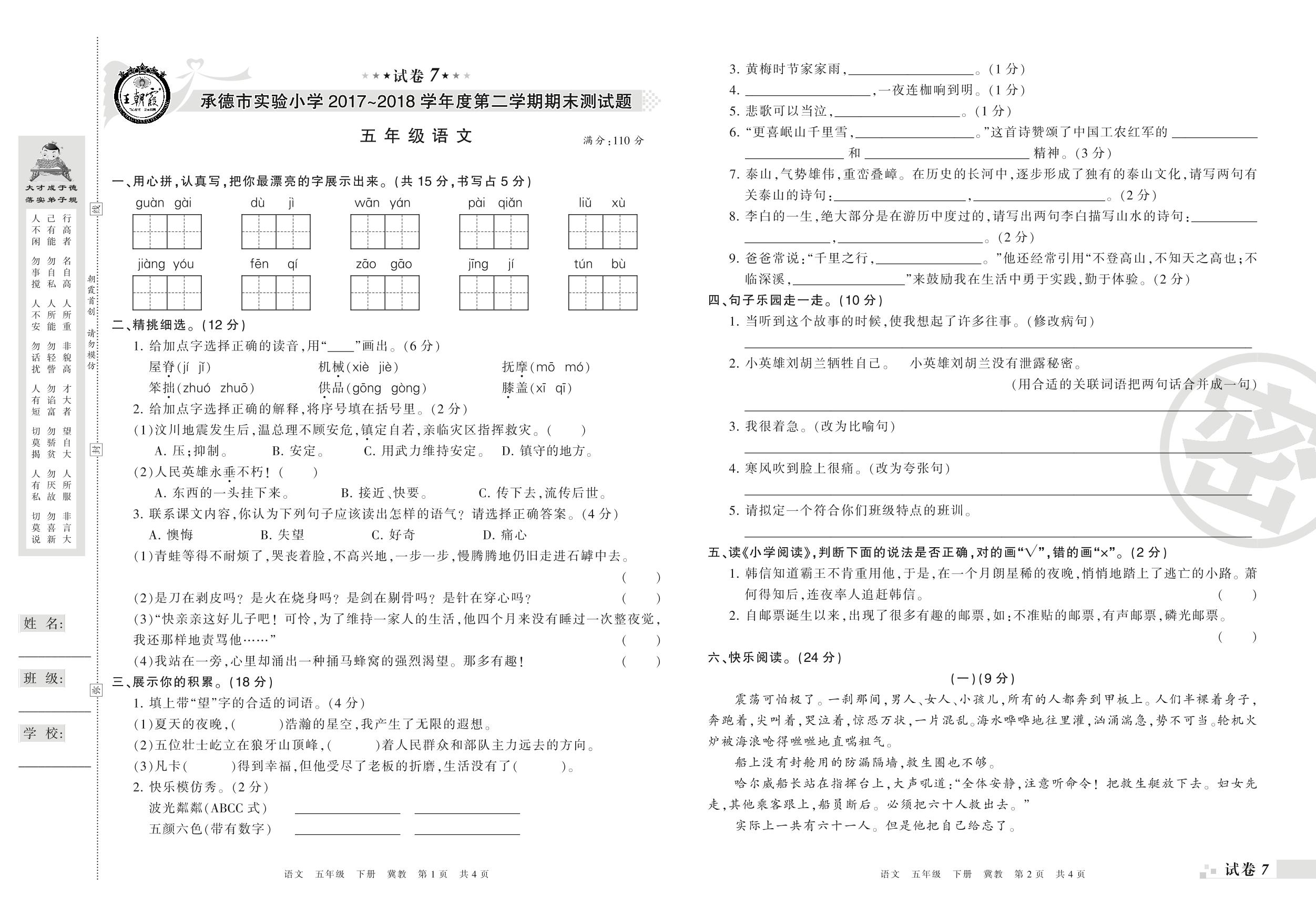 2017-2018学年第二学期承德市实验小学五年级语文试卷(冀教版)【7】