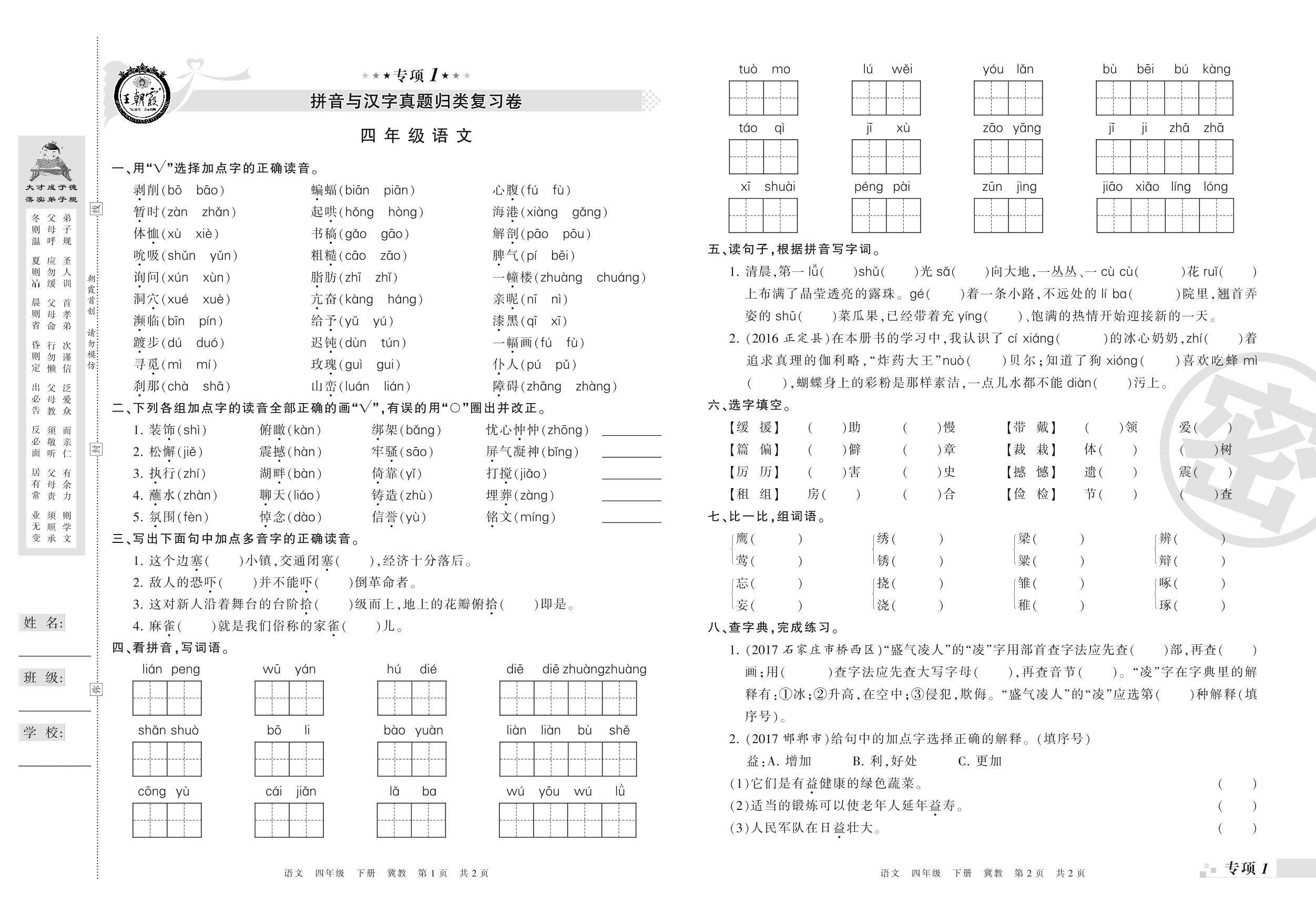 王朝霞期末专项卷——拼音与汉字、词语真题归类复习四年级下册语文(冀教版)【0】