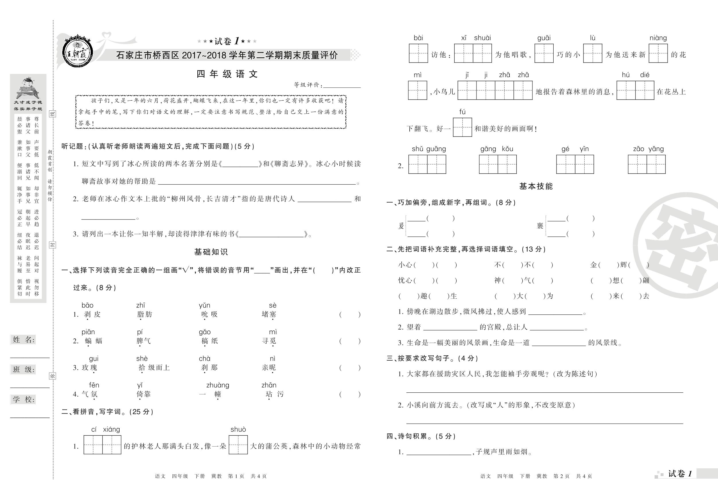2017-2018学年第二学期石家庄市桥西区四年级语文试卷(冀教版)【1】