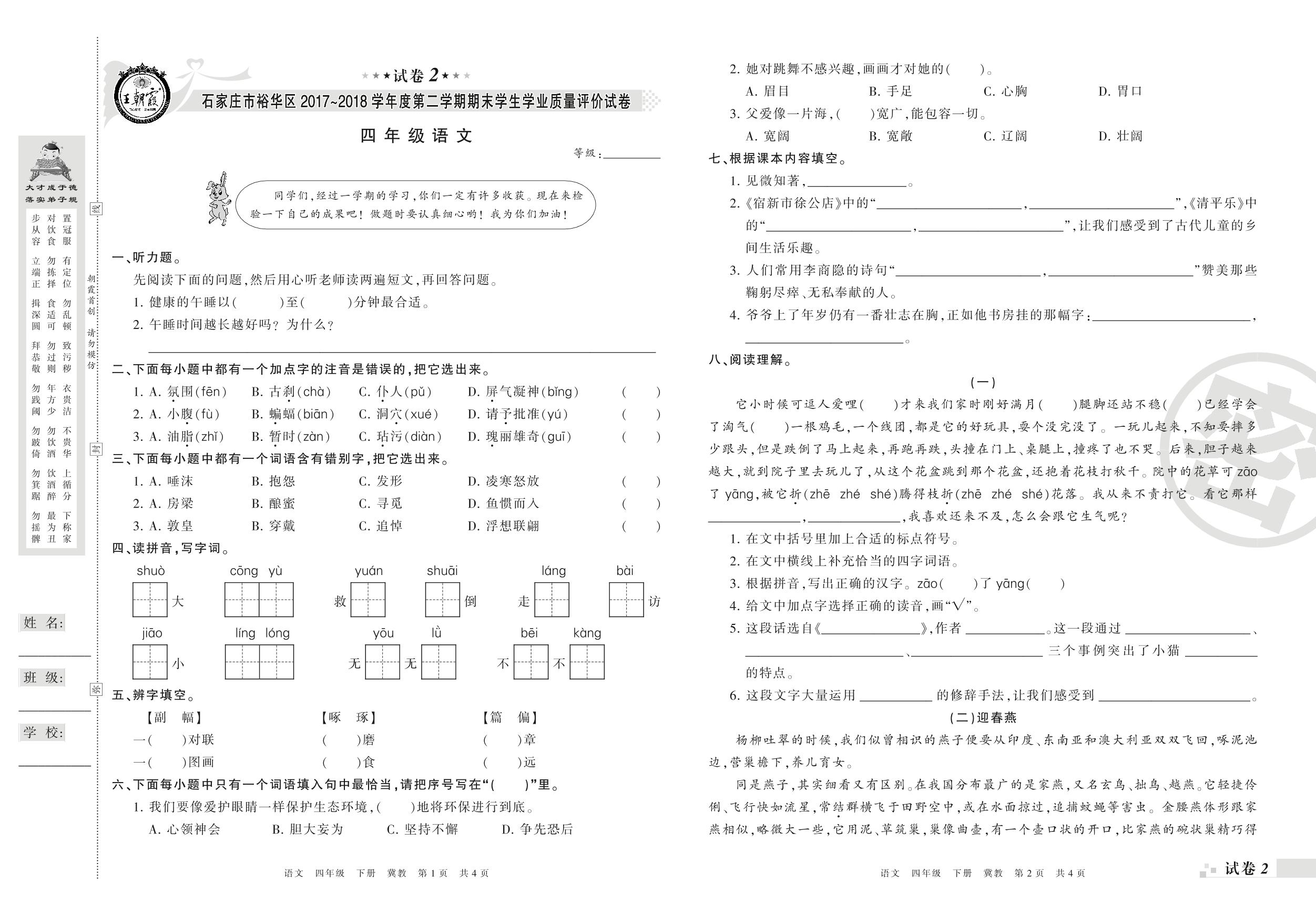 2017-2018学年第二学期石家庄市裕华区四年级语文试卷(冀教版)【2】