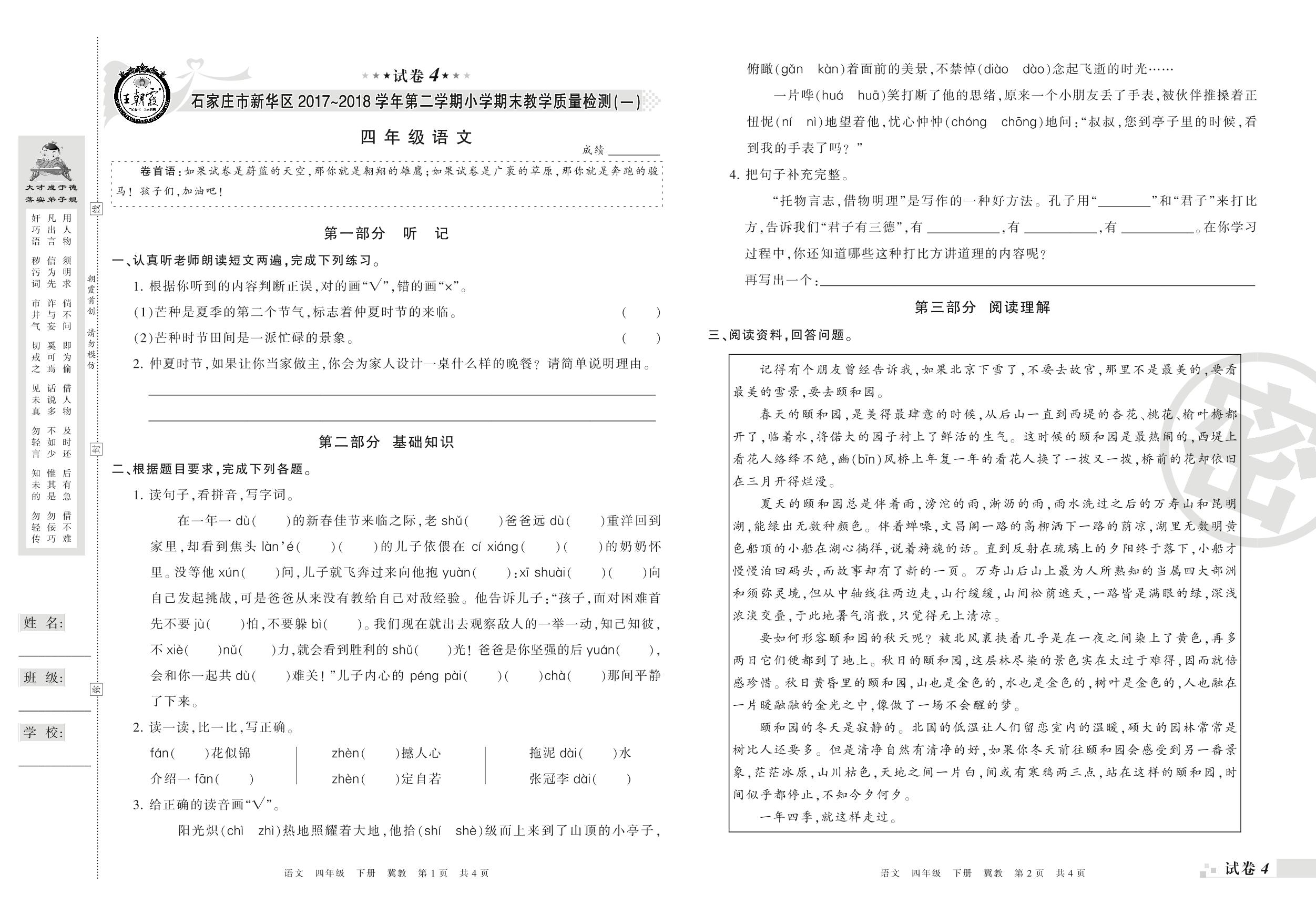 2017-2018学年第二学期石家庄市新华区四年级语文试卷(冀教版)【4】