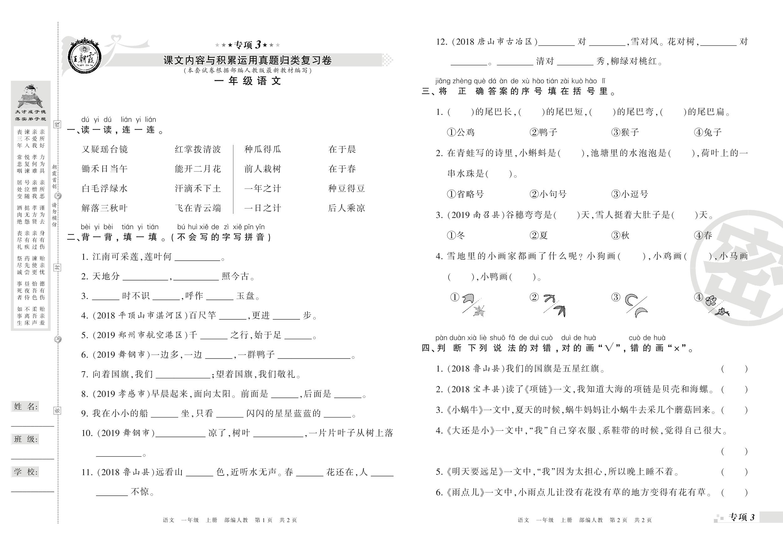 王朝霞期末专项卷——课文内容与积累运用、口语交际与写话真题归类复习卷一年级上册语文(人教版)_R210731181451【0】