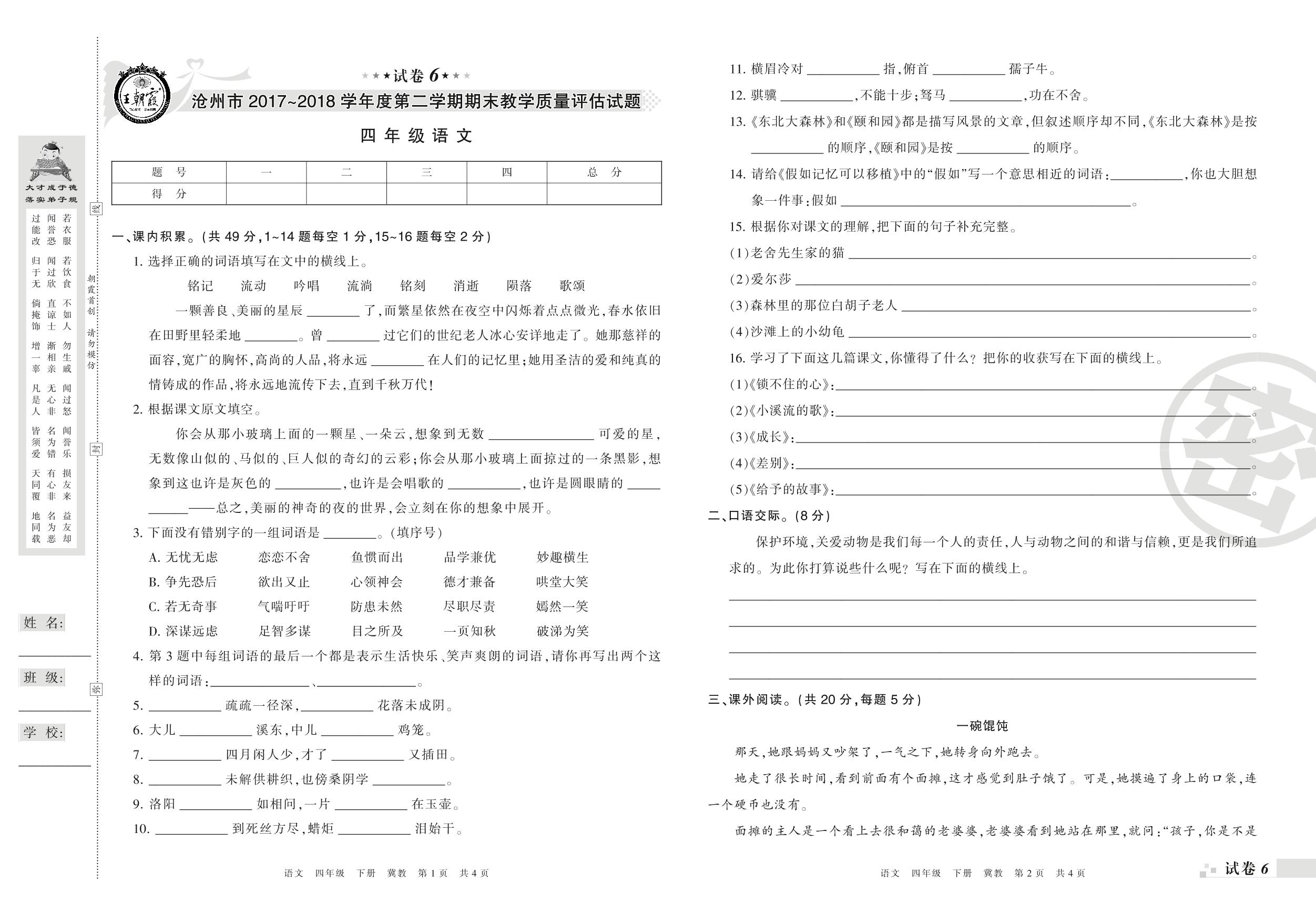 2017-2018学年第二学期沧州市四年级语文试卷(冀教版)【6】