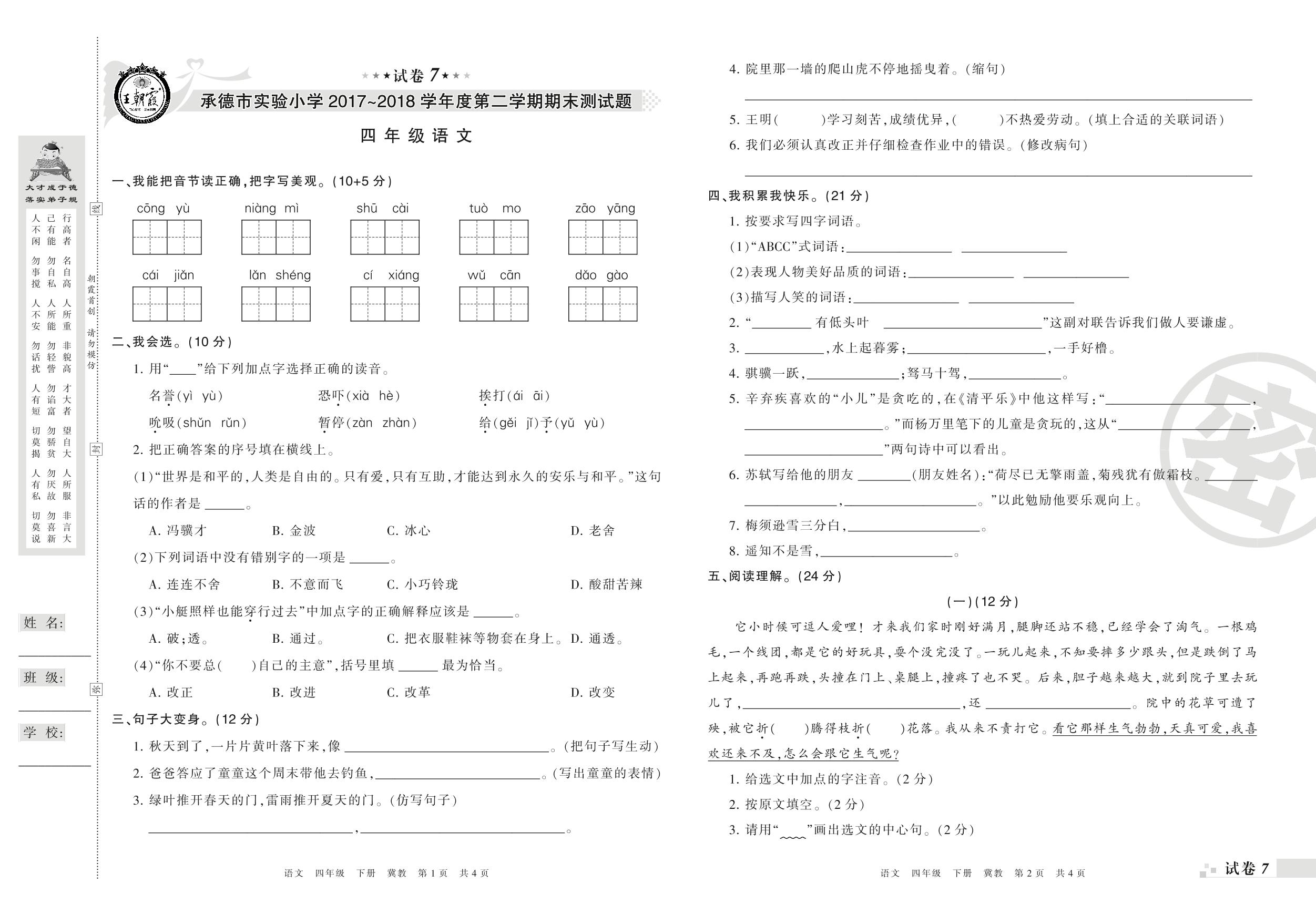 2017-2018学年第二学期承德市实验小学四年级语文试卷(冀教版)【7】