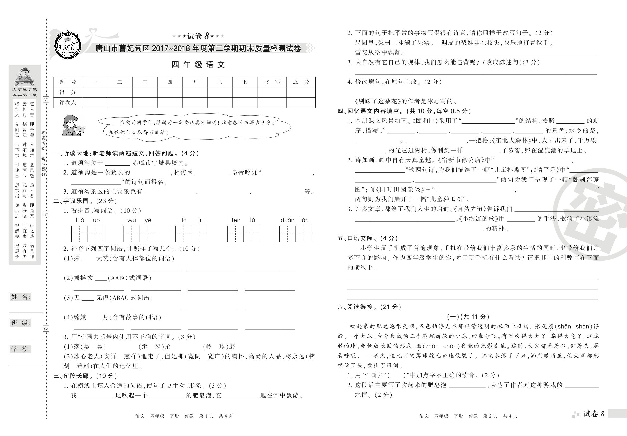 2017-2018学年第二学期唐山市曹妃甸区四年级语文试卷(冀教版)【8】