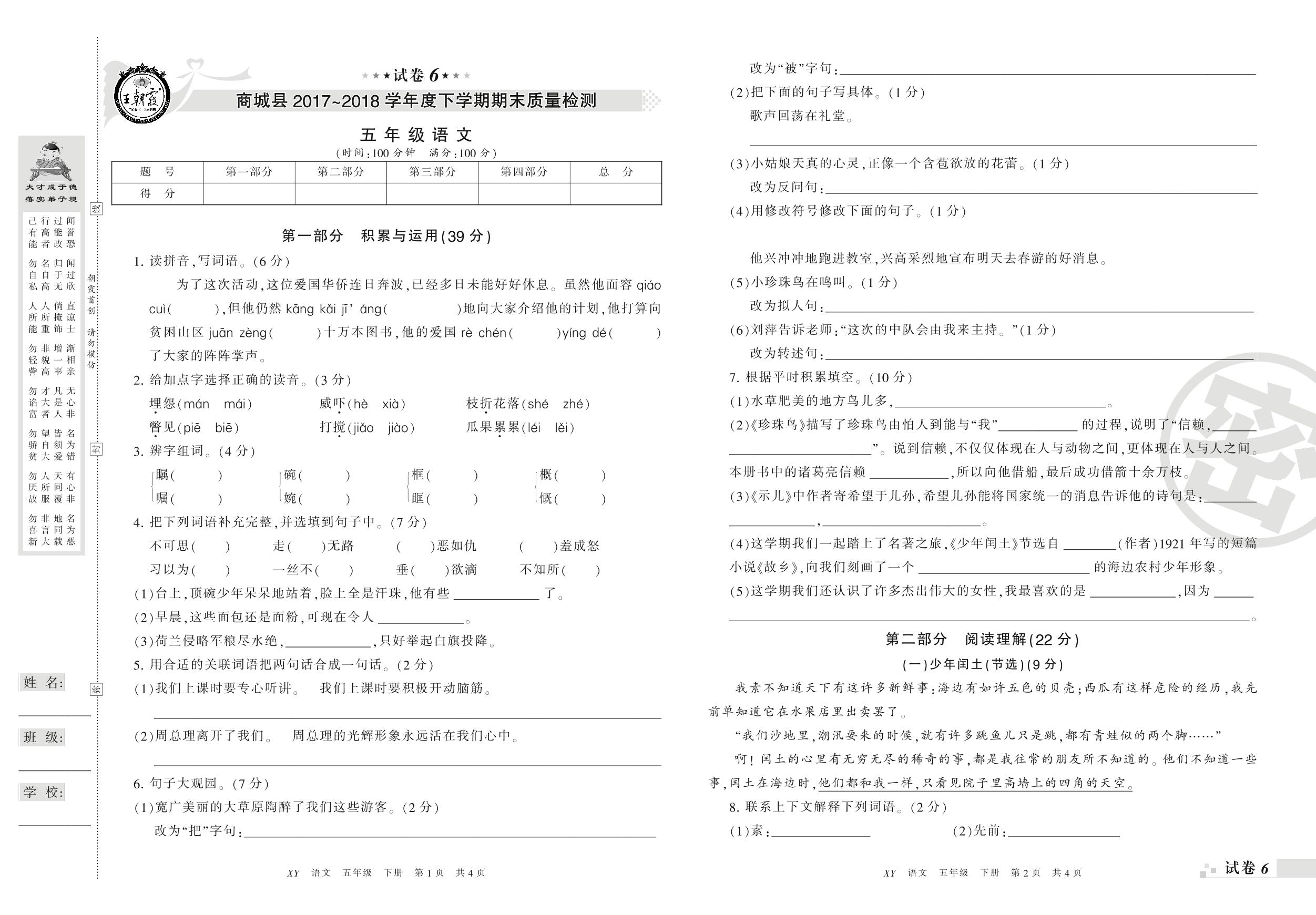 2017-2018学年第二学期信阳市商城县五年级语文试卷(S版)【6】