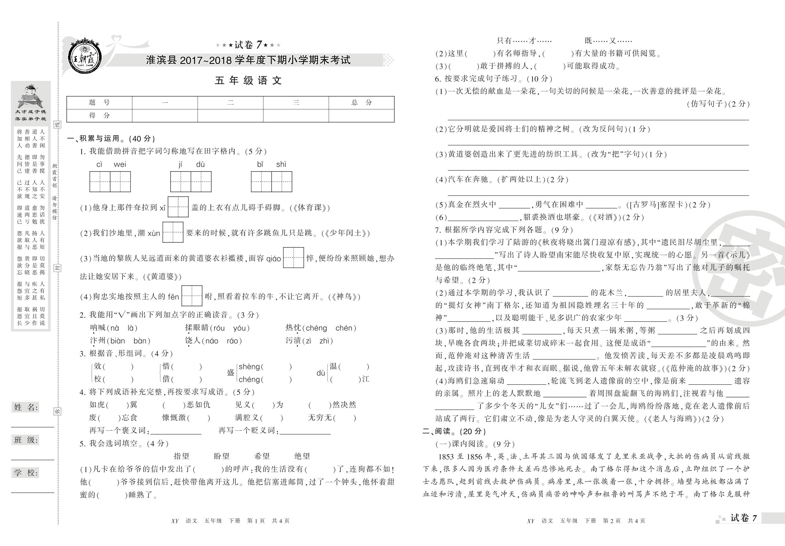 2017-2018学年第二学期信阳市淮滨县五年级语文试卷(S版)【7】