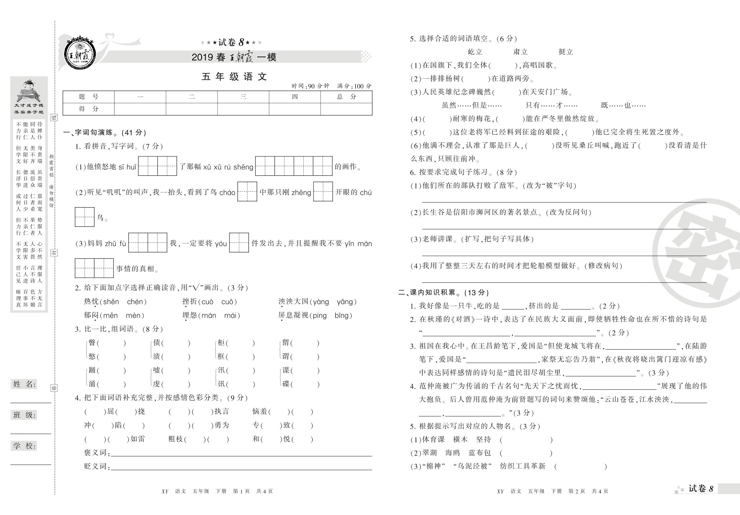 王朝霞期末模拟卷五年级下册语文(S版)_R210801200722【8】