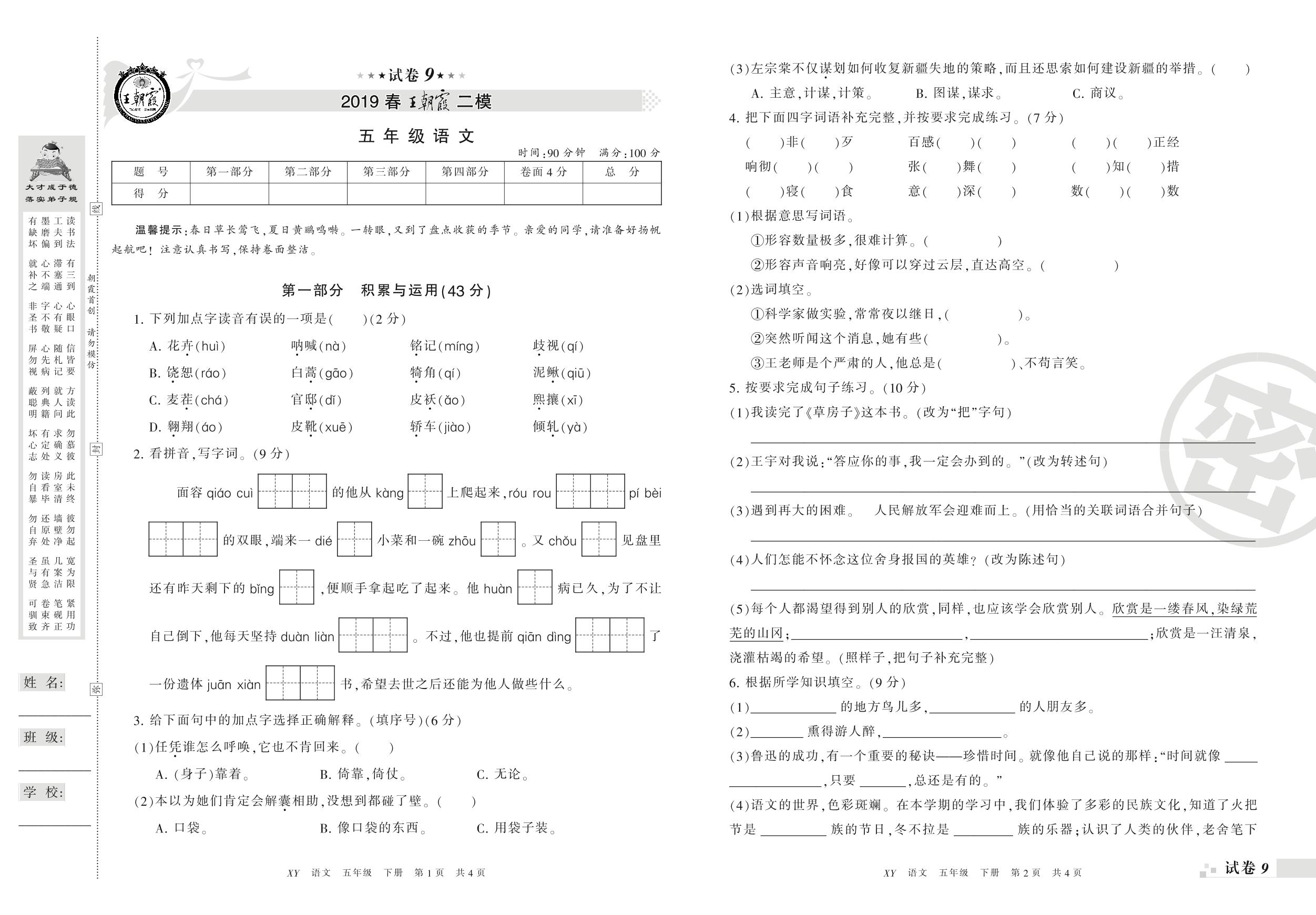 王朝霞期末模拟卷五年级下册语文(S版)_R210801200726【9】