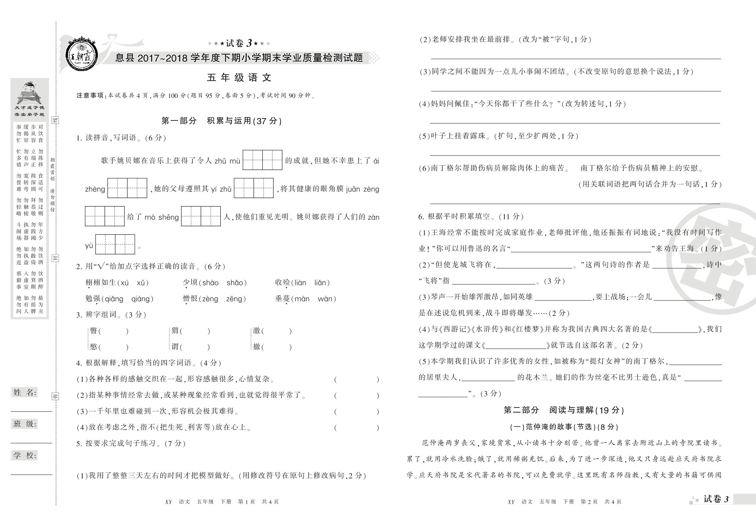 2017-2018学年第二学期信阳市息县五年级语文试卷(S版)【3】