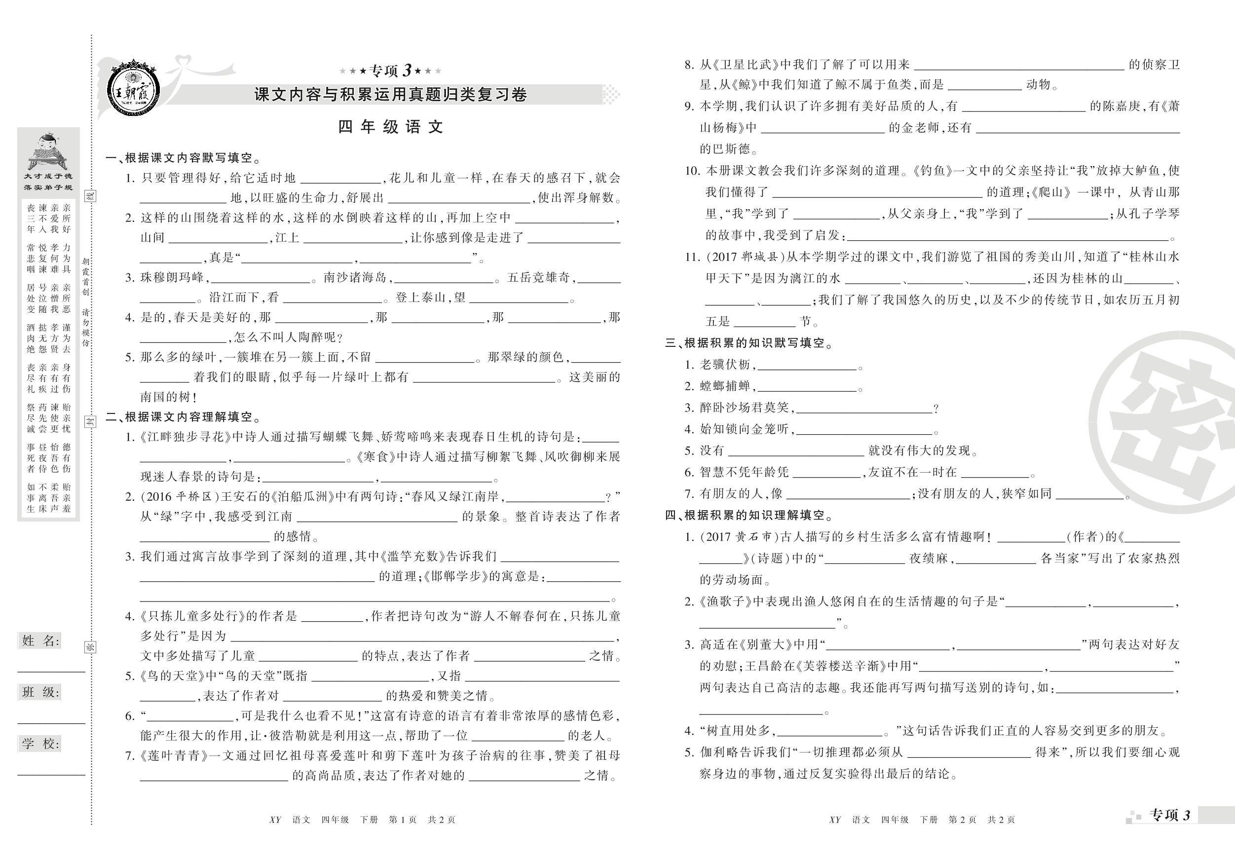 王朝霞期末专项卷——课文内容与积累运用、课内阅读与写作真题归类复习四年级下册语文(S版)_R210801200812【0】