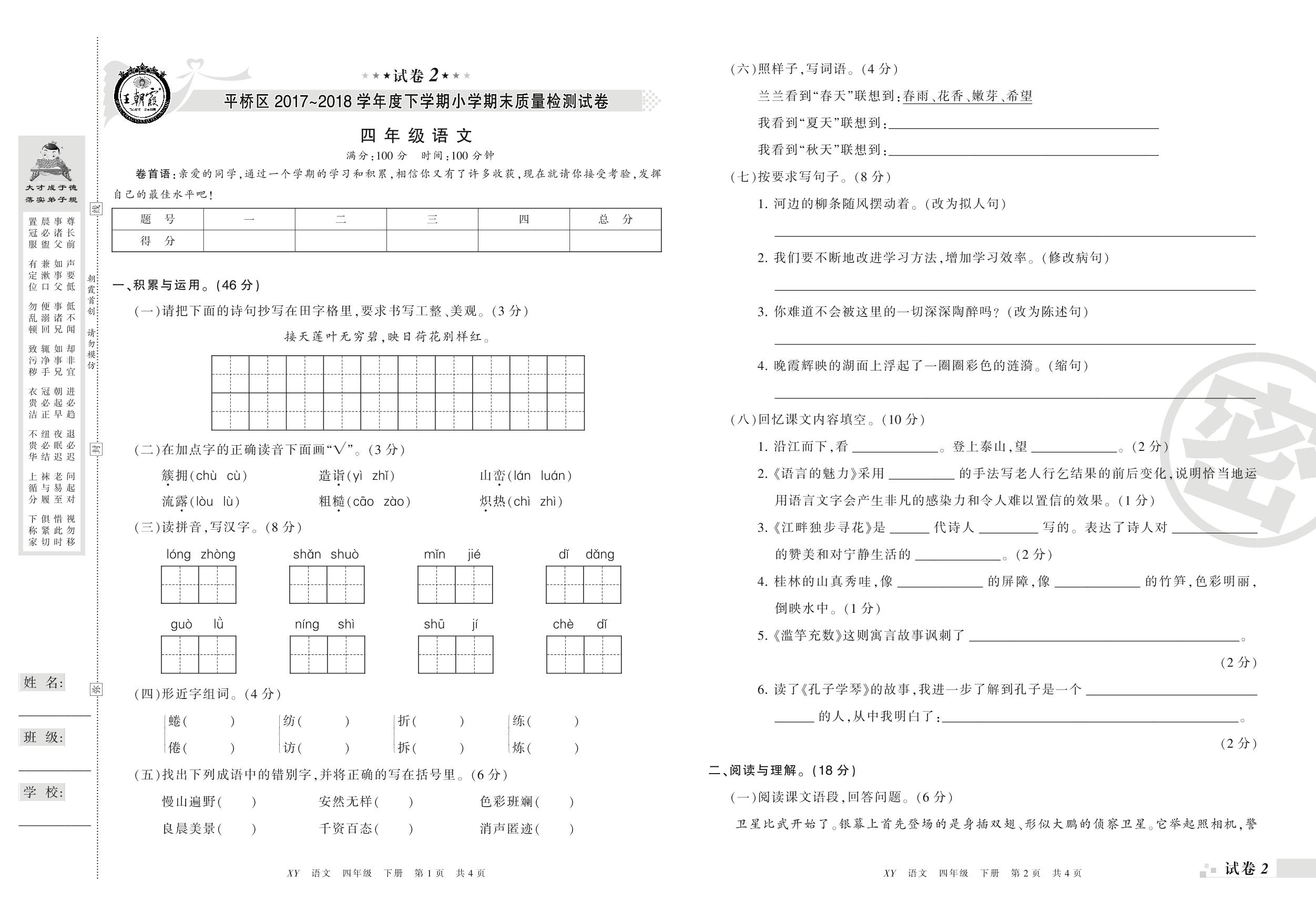 2017-2018学年第二学期信阳市平桥区四年级语文试卷(S版)【2】