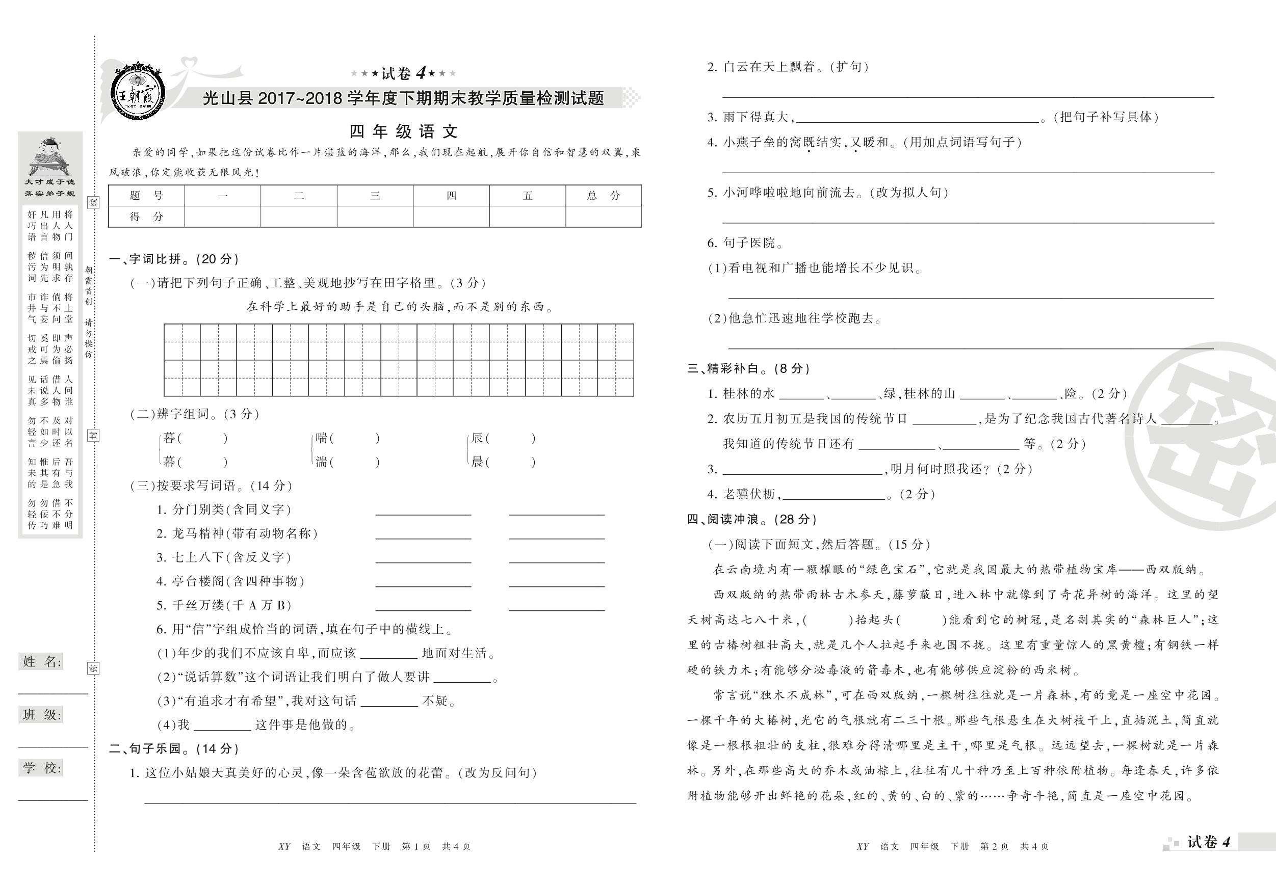 2017-2018学年第二学期信阳市光山县四年级语文试卷(S版)【4】