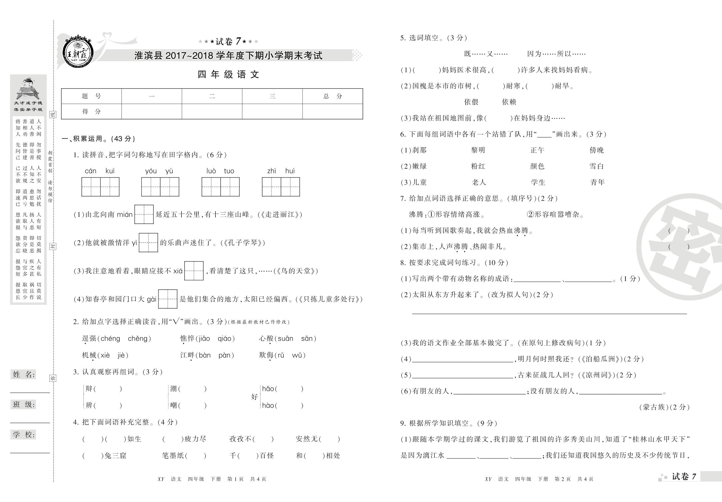2017-2018学年第二学期信阳市淮滨县四年级语文试卷(S版)【7】