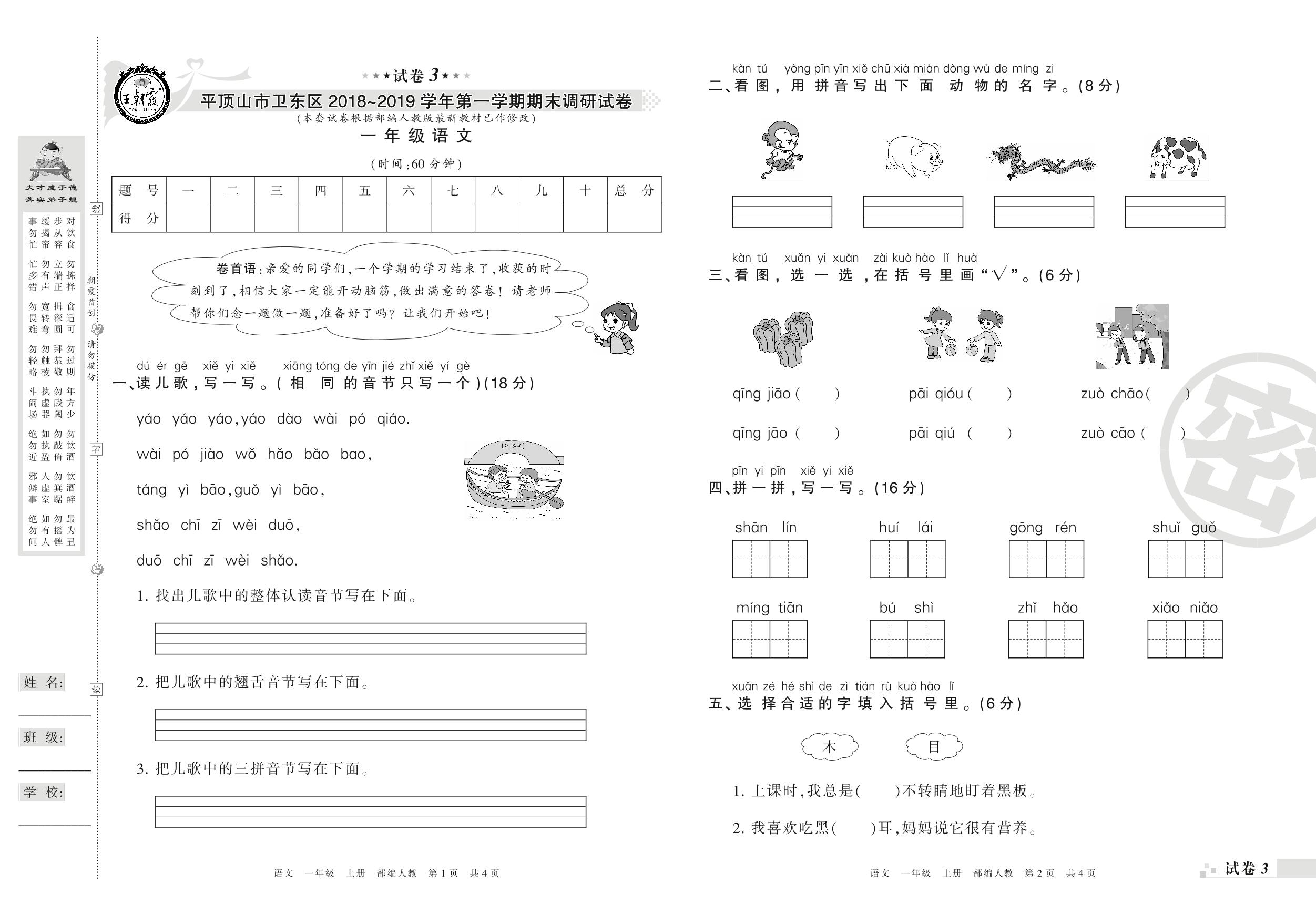 2018-2019学年第一学期平顶山市卫东区一年级语文试卷(人教版)【3】