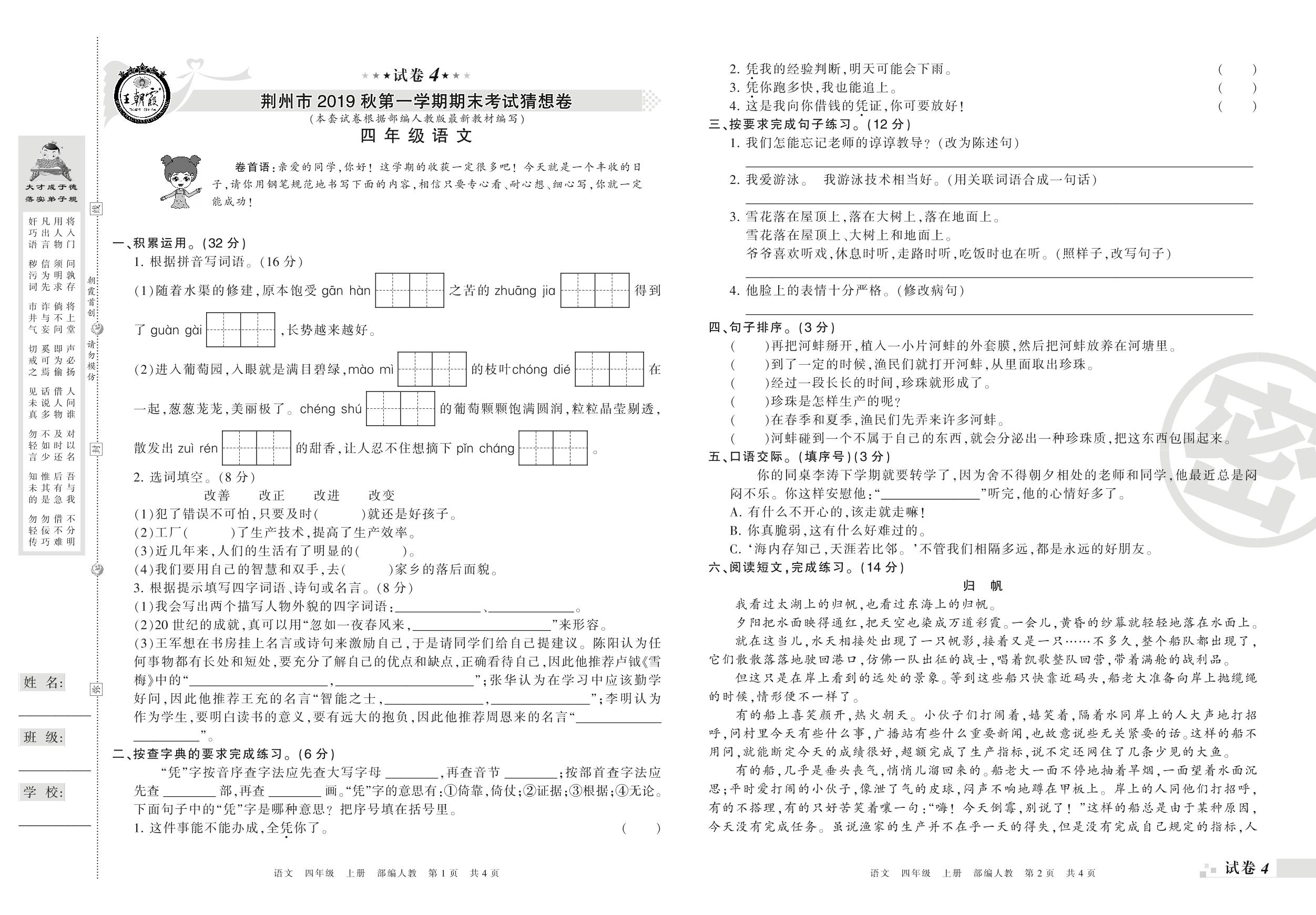 2019-2020学年第一学期荆州市猜想卷四年级语文试卷(人教版)【4】