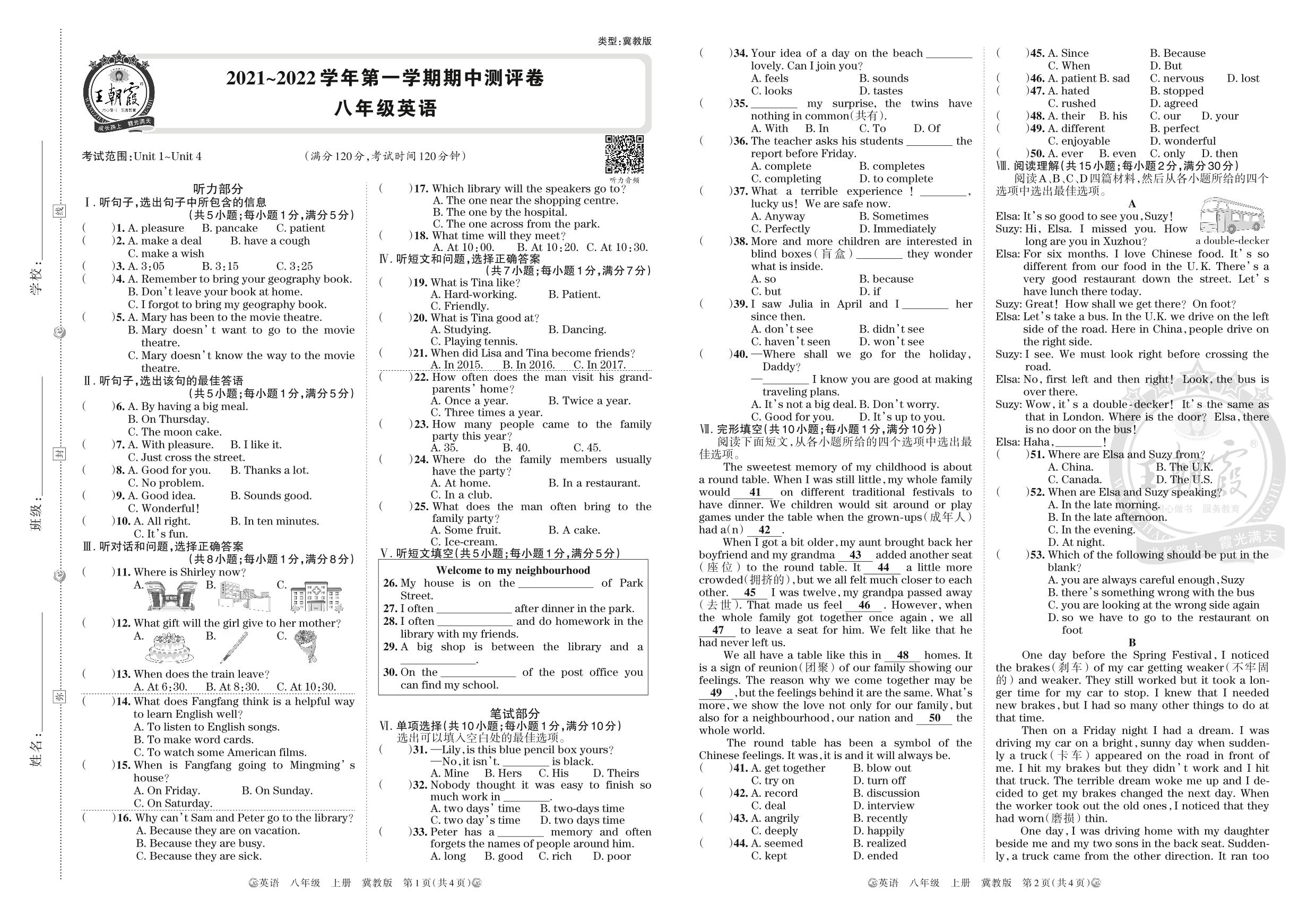 2021~2022学年第一学期期中测评卷 八年级英语(冀教版)