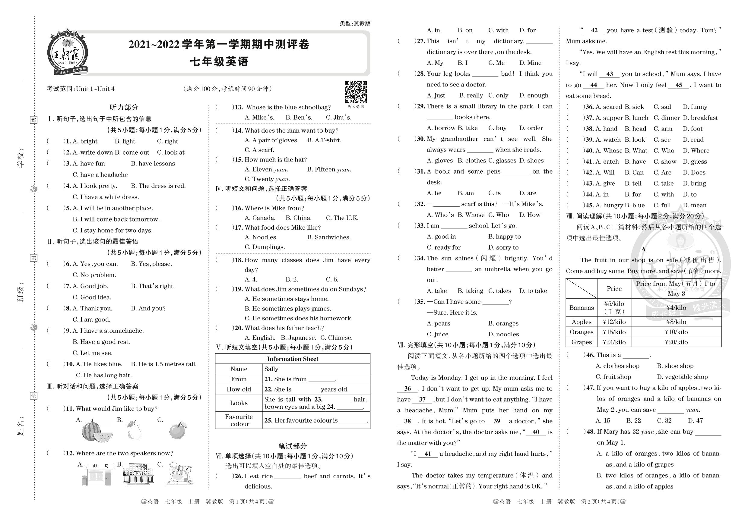 2021~2022学年第一学期期中测评卷 七年级英语(冀教版)