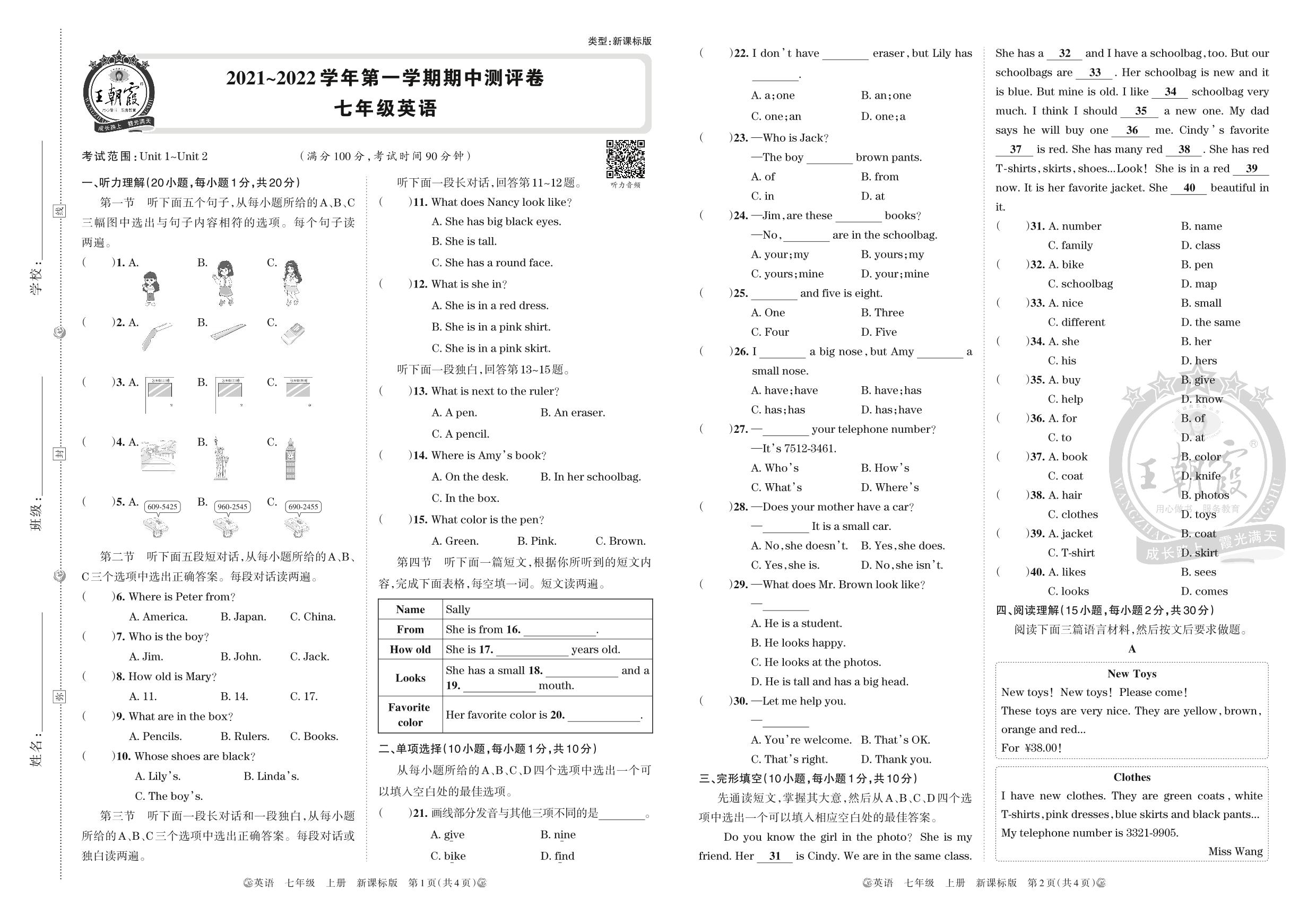 2021~2022学年第一学期期中测评卷 七年级英语(新课标版)
