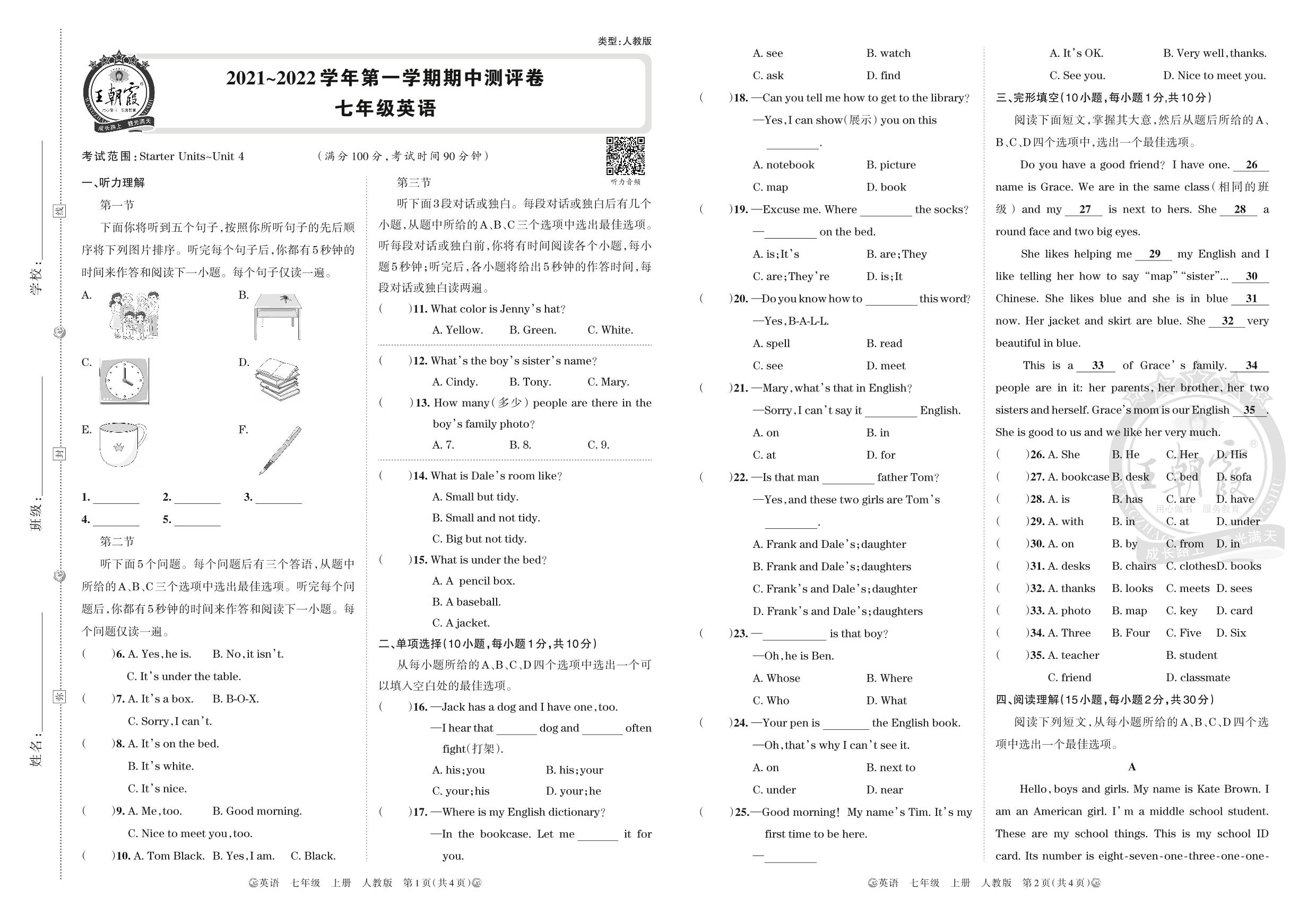2021~2022学年第一学期期中测评卷 七年级英语(人教版)