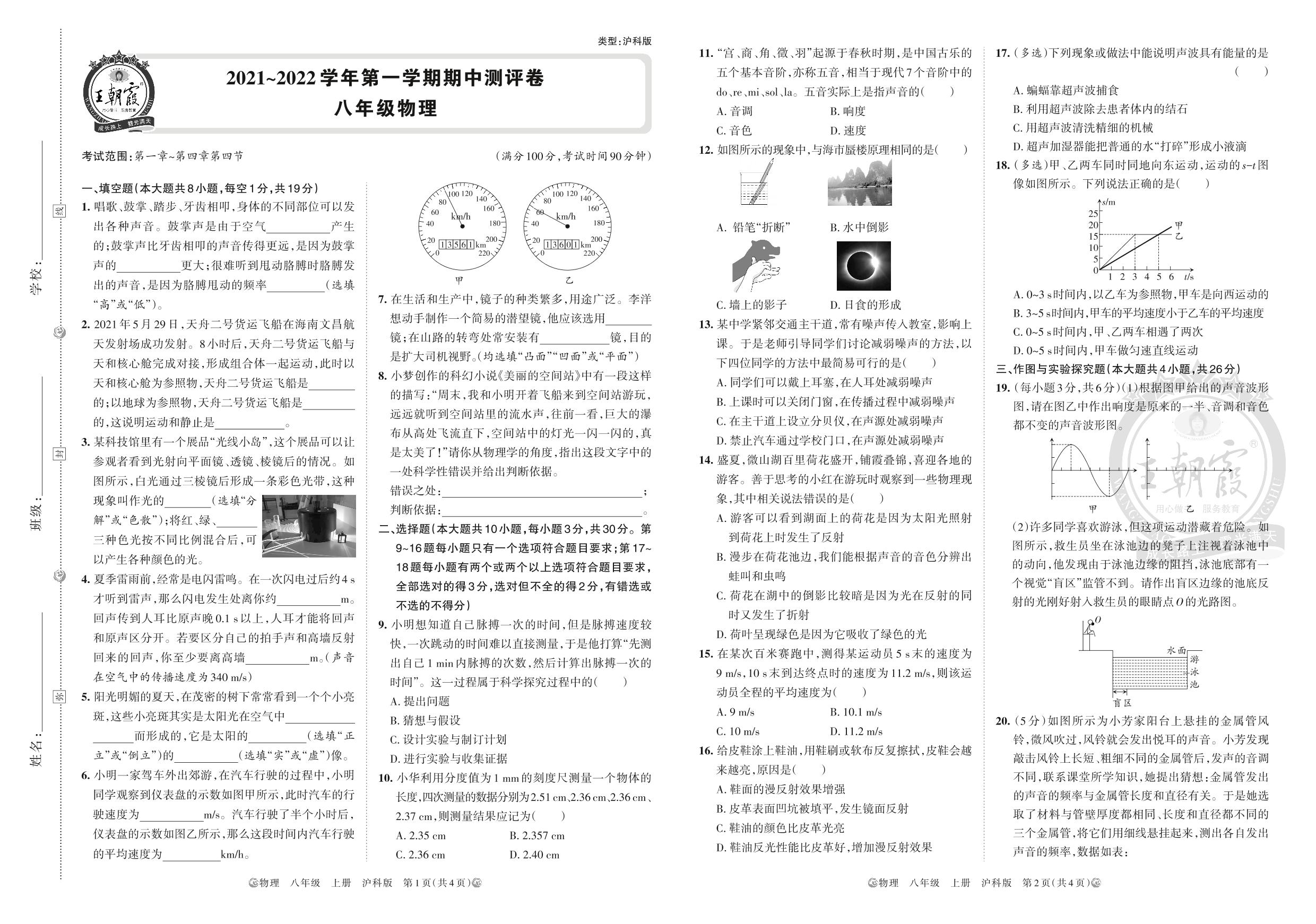 2021~2022学年第一学期期中测评卷 八年级物理(沪科版)