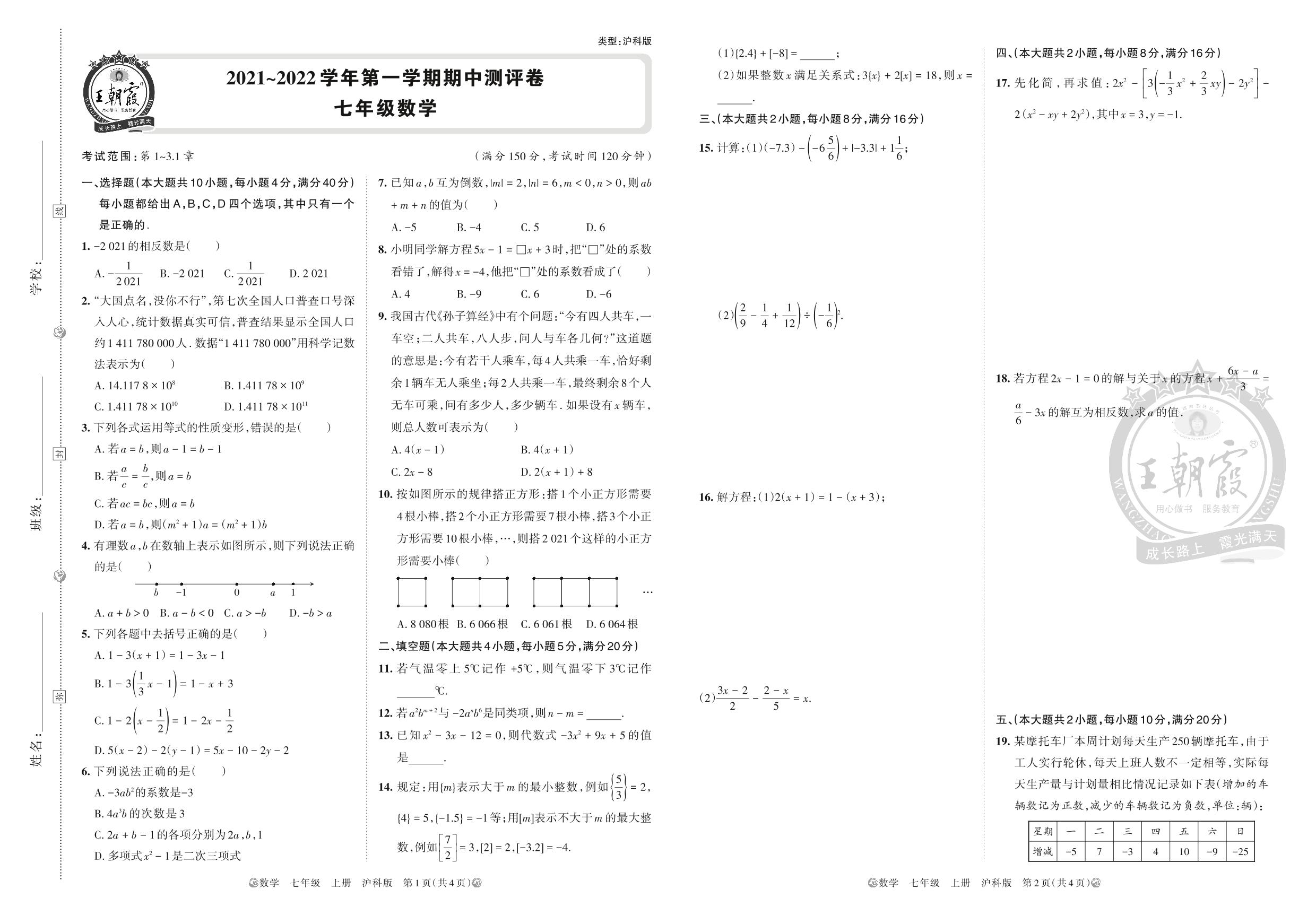 2021~2022学年第一学期期中测评卷 七年级数学(沪科版)