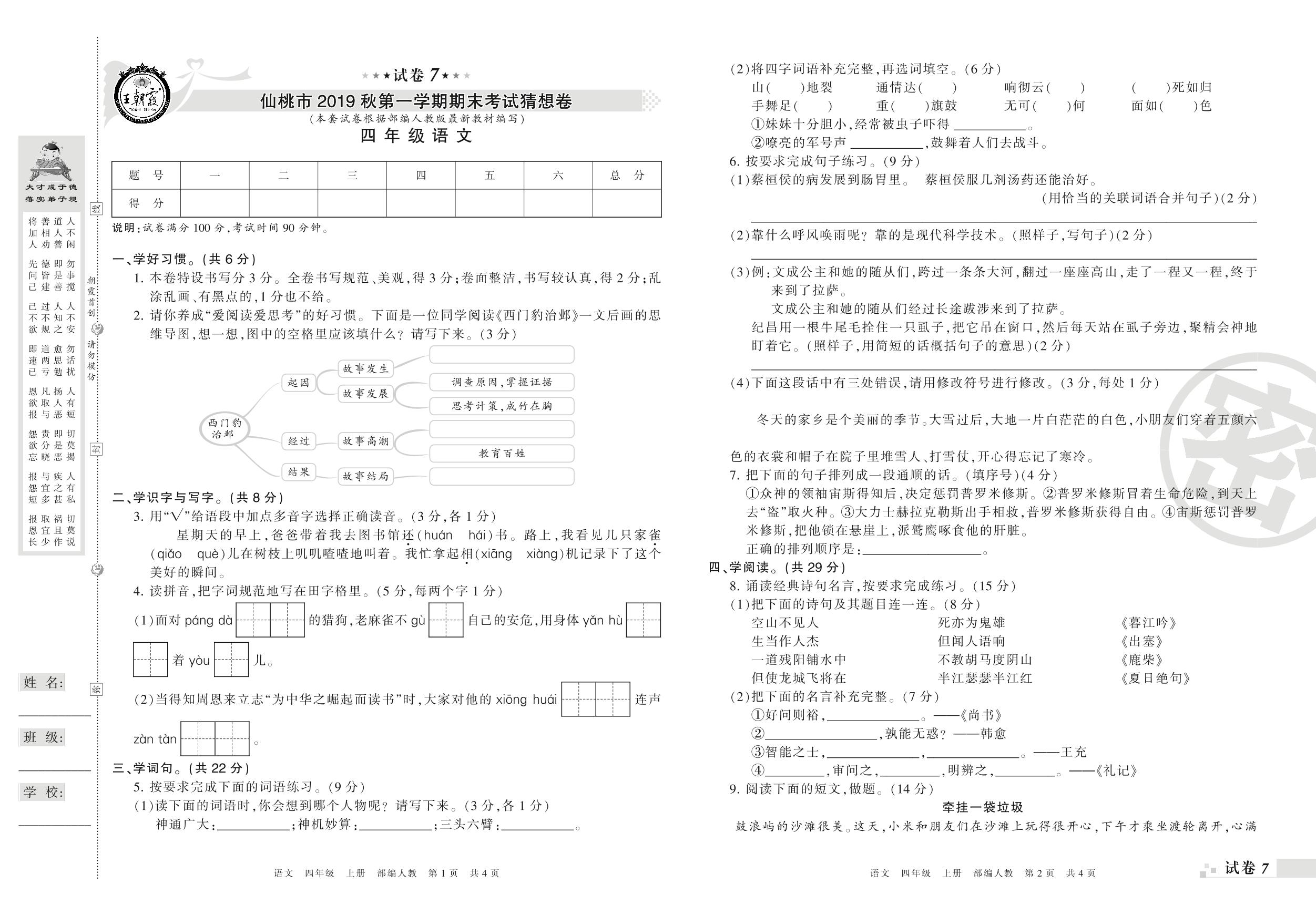 2019-2020学年第一学期仙桃市猜想卷四年级语文试卷(人教版)【7】