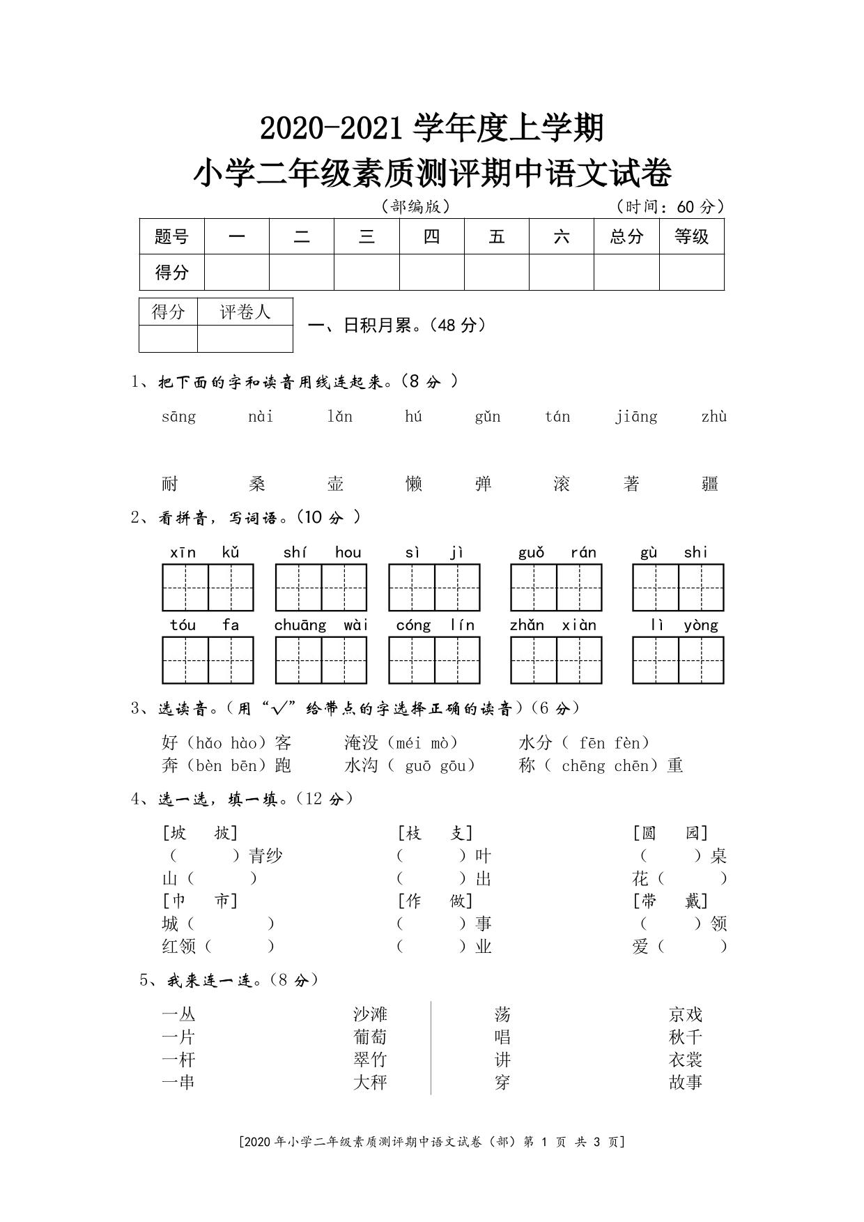 二年级语文人教版上册期中卷