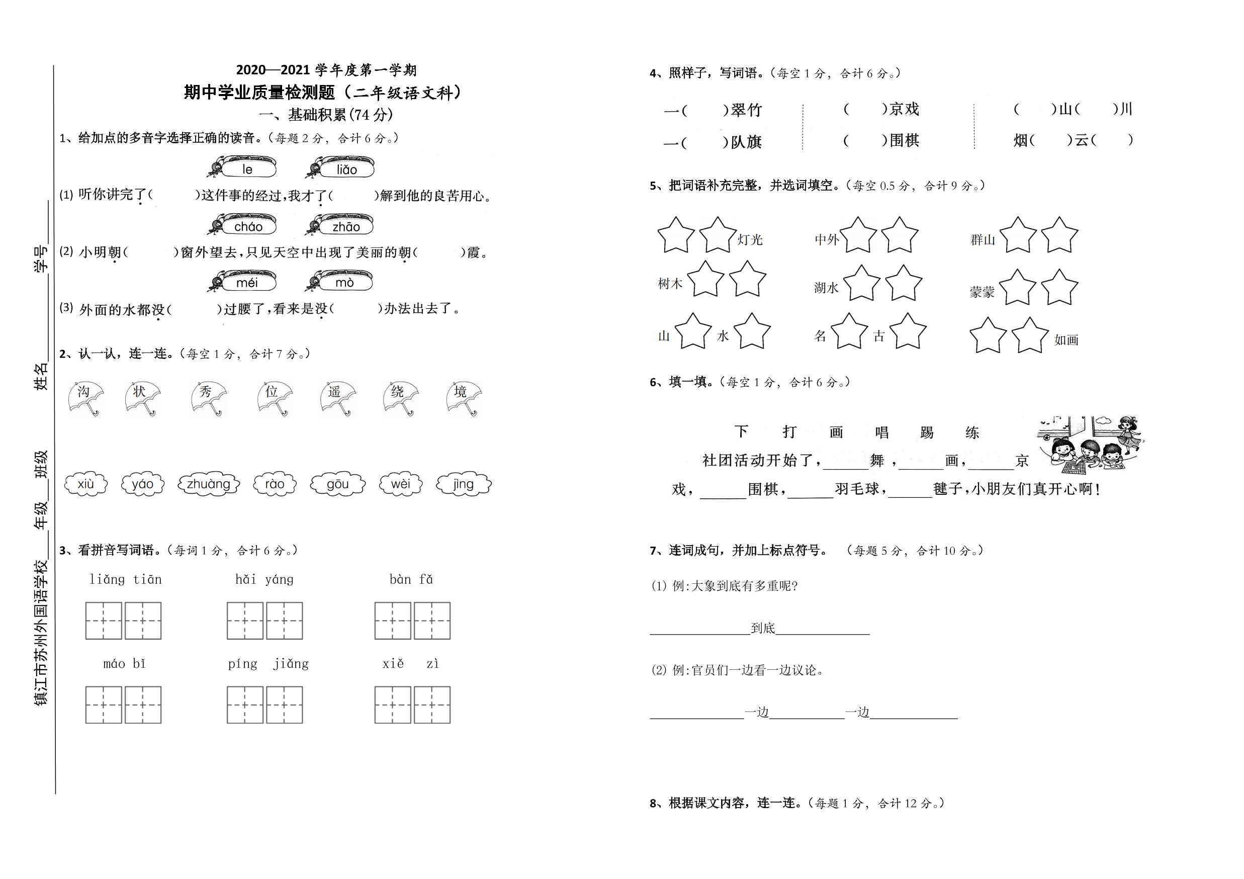 江苏省镇江市苏州外国语学校2020—2021学年度第一学期期中学业质量检测题(二年级语文科)人教版
