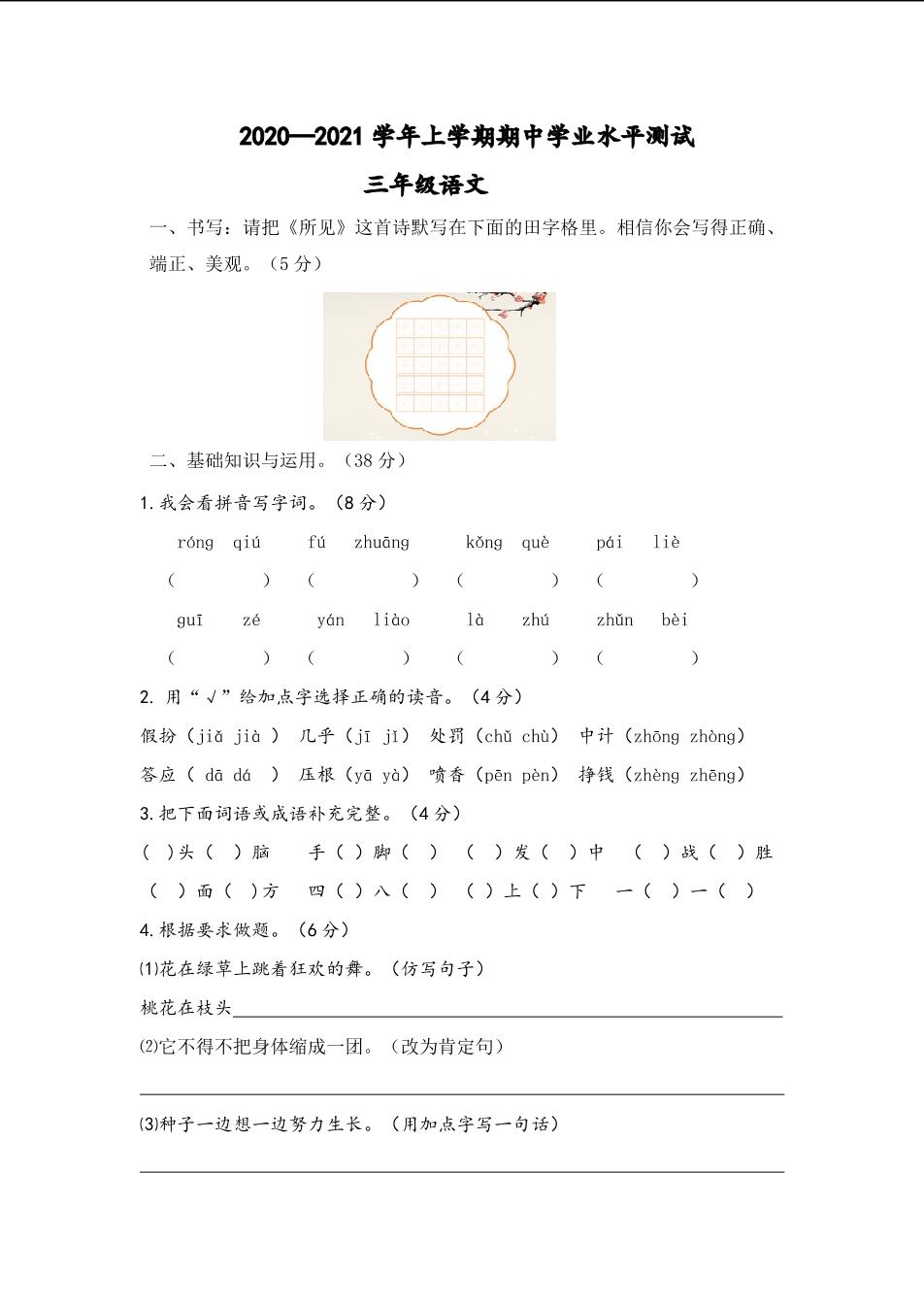 河南省郑州市登封市2020—2021学年上学期期中学业水平测试三年级语文人教版