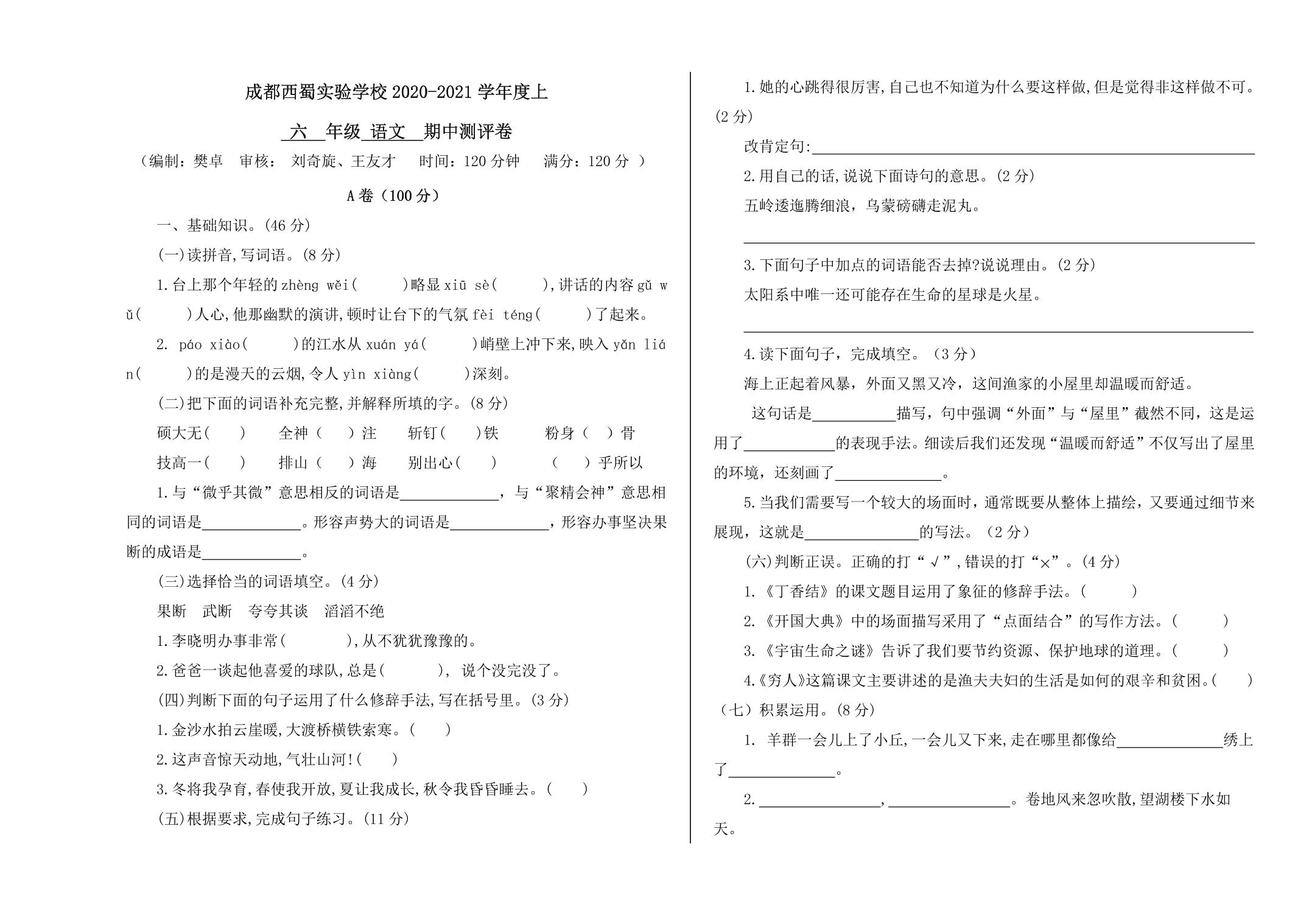 四川省成都市武侯区西蜀实验学校2020-2021学年度上六年级语文期中测评卷人教版