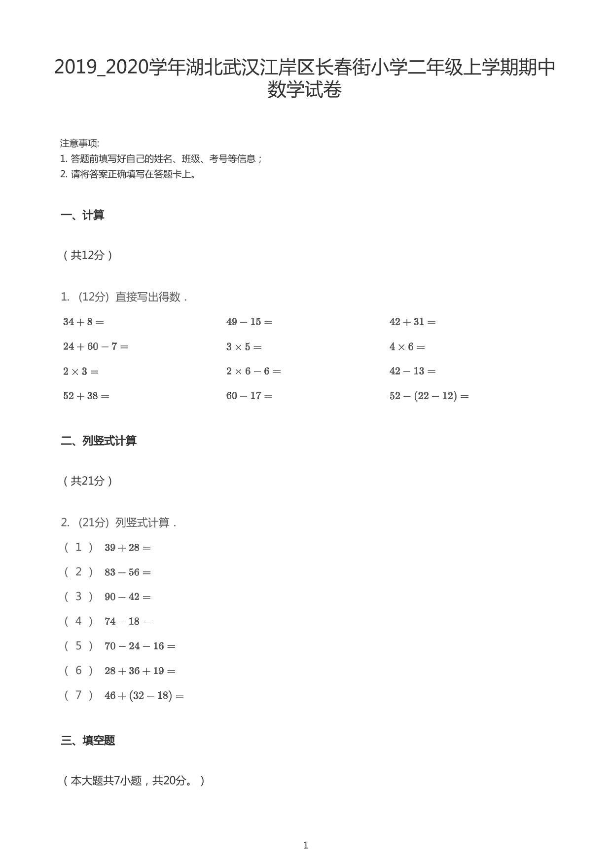 湖北省武汉市江岸区长春街小学2019-2020学年二年级上学期期中数学试卷人教版