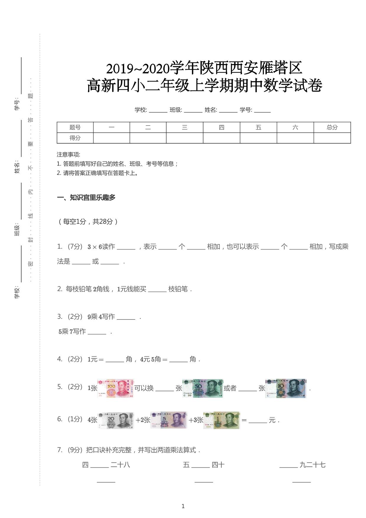 陕西省西安市雁塔区高新四小2019-2020学年二年级上学期期中数学试卷北师版