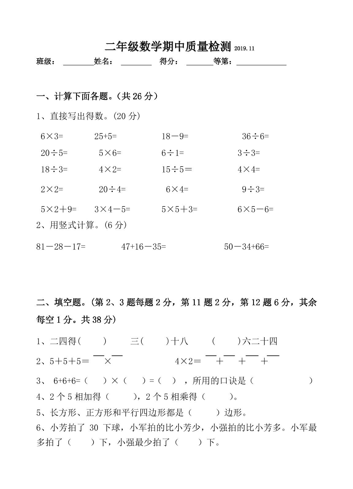 江苏省扬州市仪征市2019-2020学年第一学期二年级数学期中质量检测苏教版