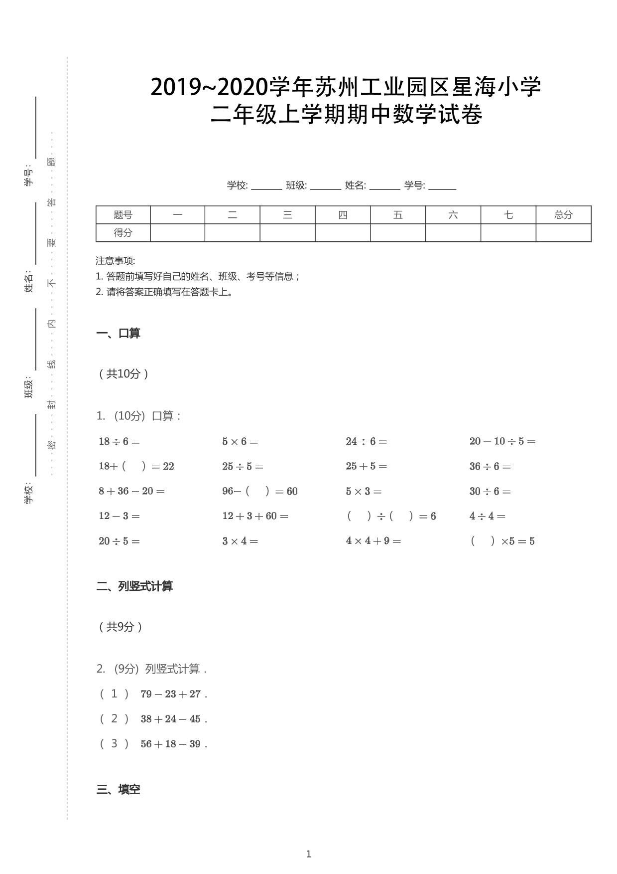 江苏省苏州市工业园区星海小学2019-2020学年二年级上学期期中数学试卷苏教版