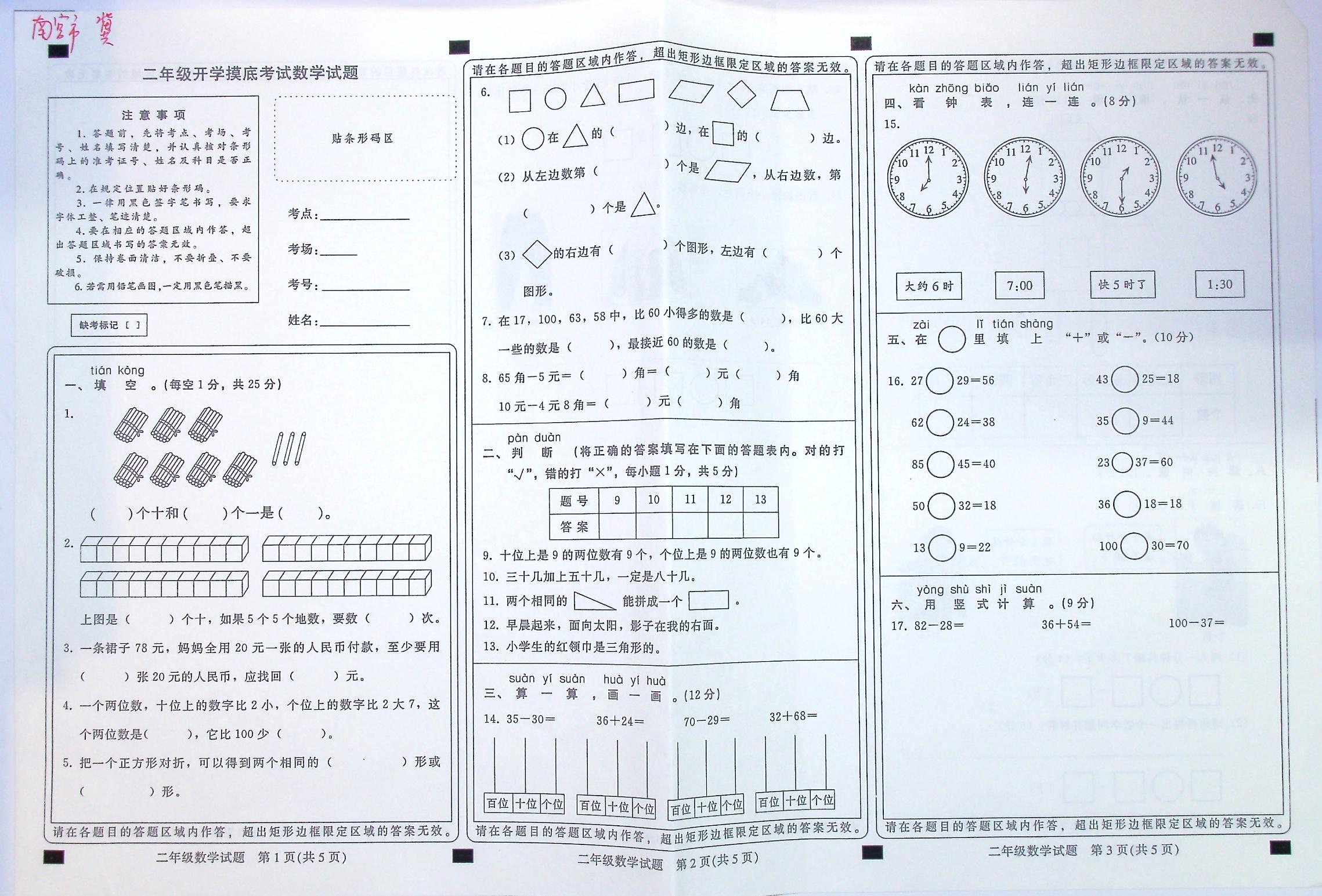 南宫市2019-2020学年二年级开学摸底考试数学试题冀教版