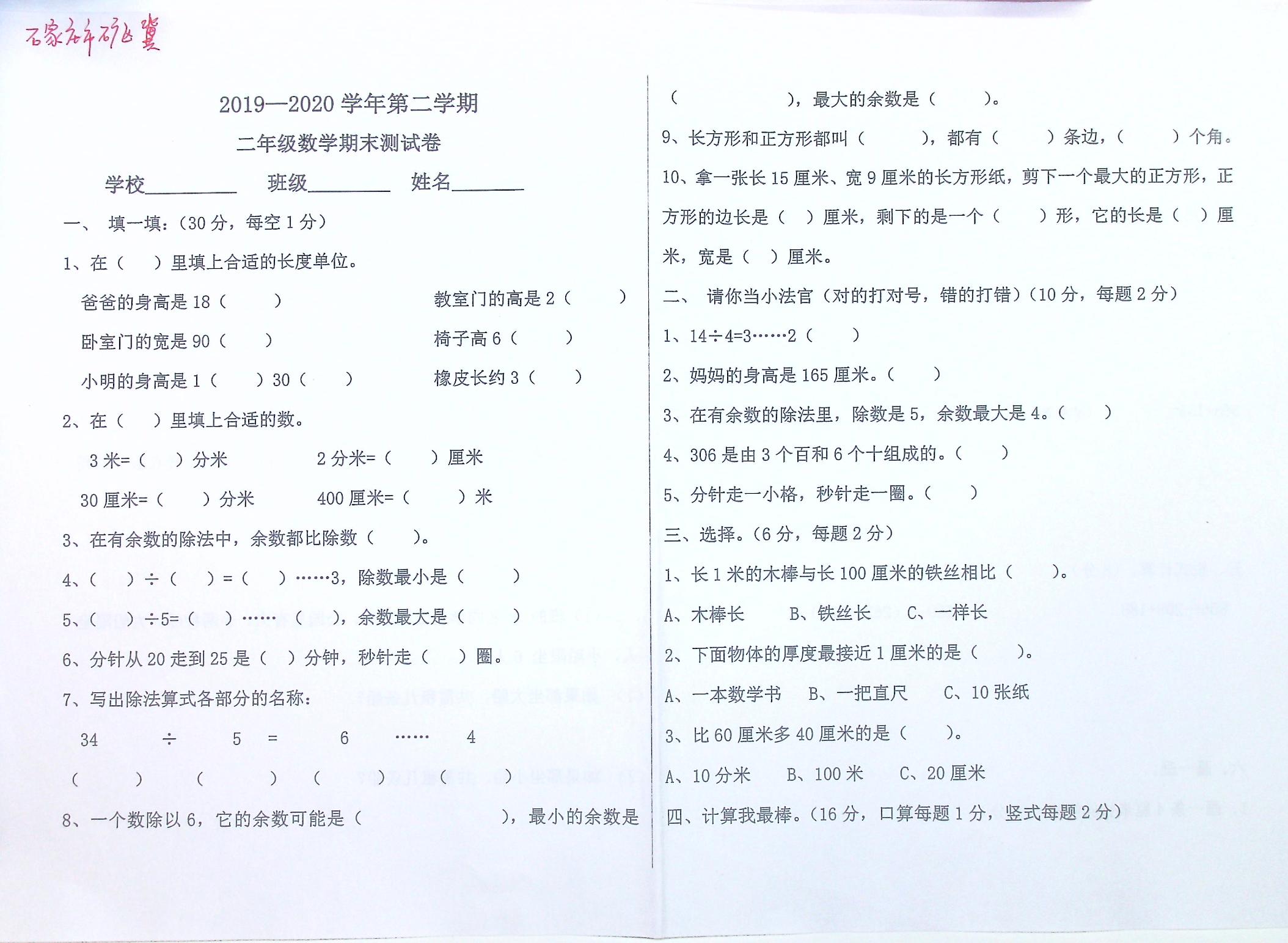 石家庄市矿区2019-2020学年第二学期二年级数学期末测试卷冀教版