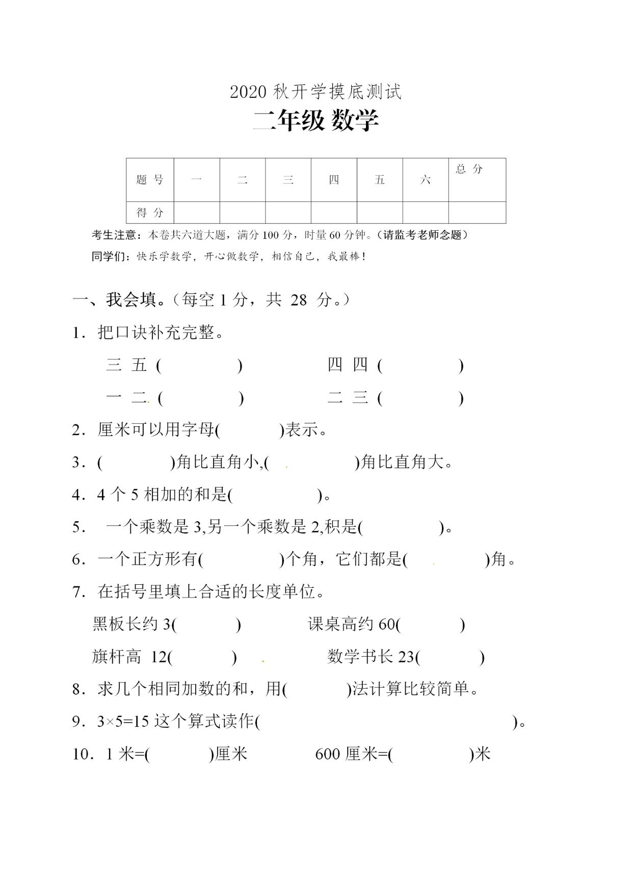 河北省石家庄市2020秋第一学期开学摸底测试二年级数学冀教版
