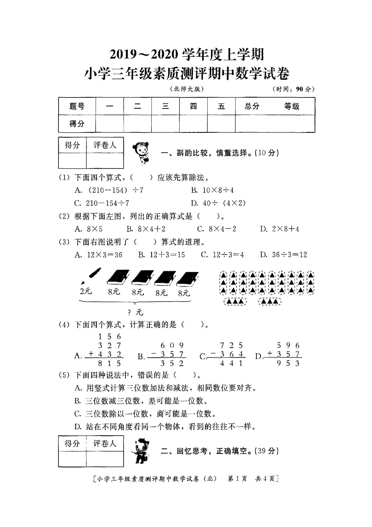 陕西省西安市雁塔区2019-2020学年度上学期小学三年级素质测评期中数学试卷北师版