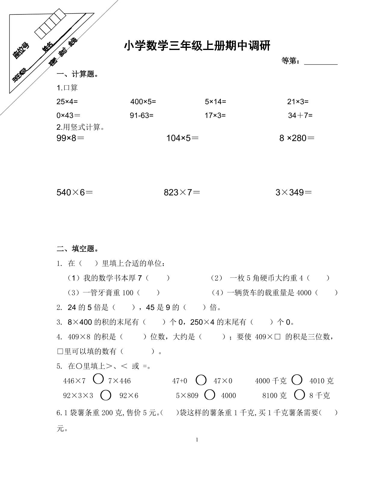 江苏省徐州市2020-2021学年小学数学三年级上册期中调研苏教版